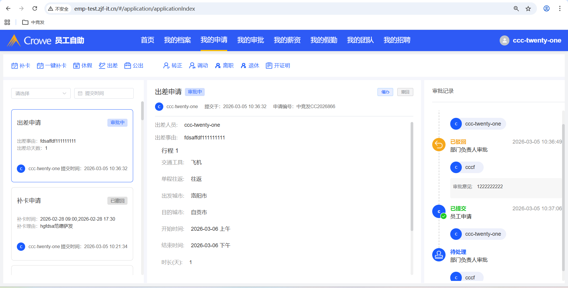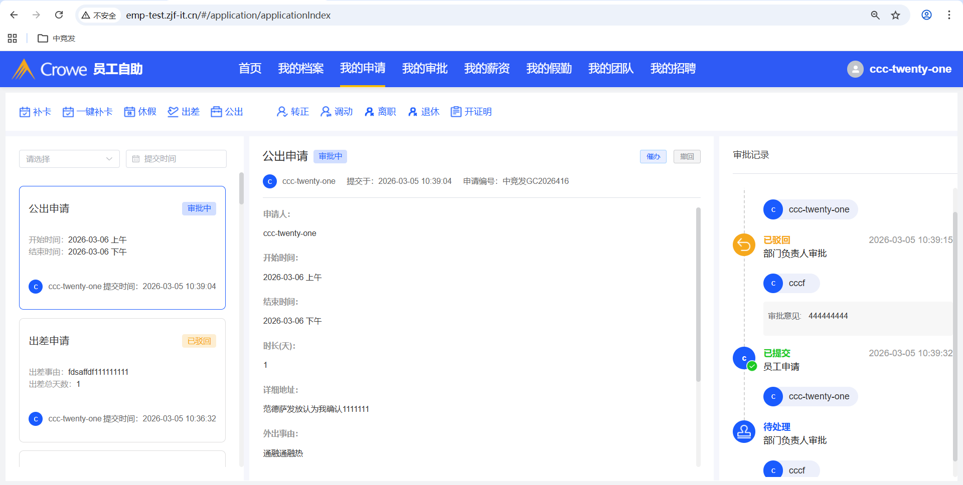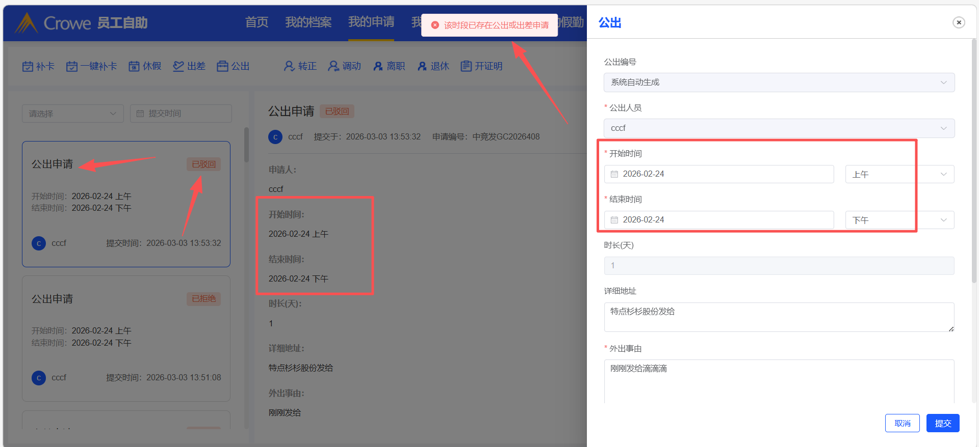 已关闭员工自助-我的申请-公出、出差申请,驳回后重新编辑(其中时间不变),无法提交