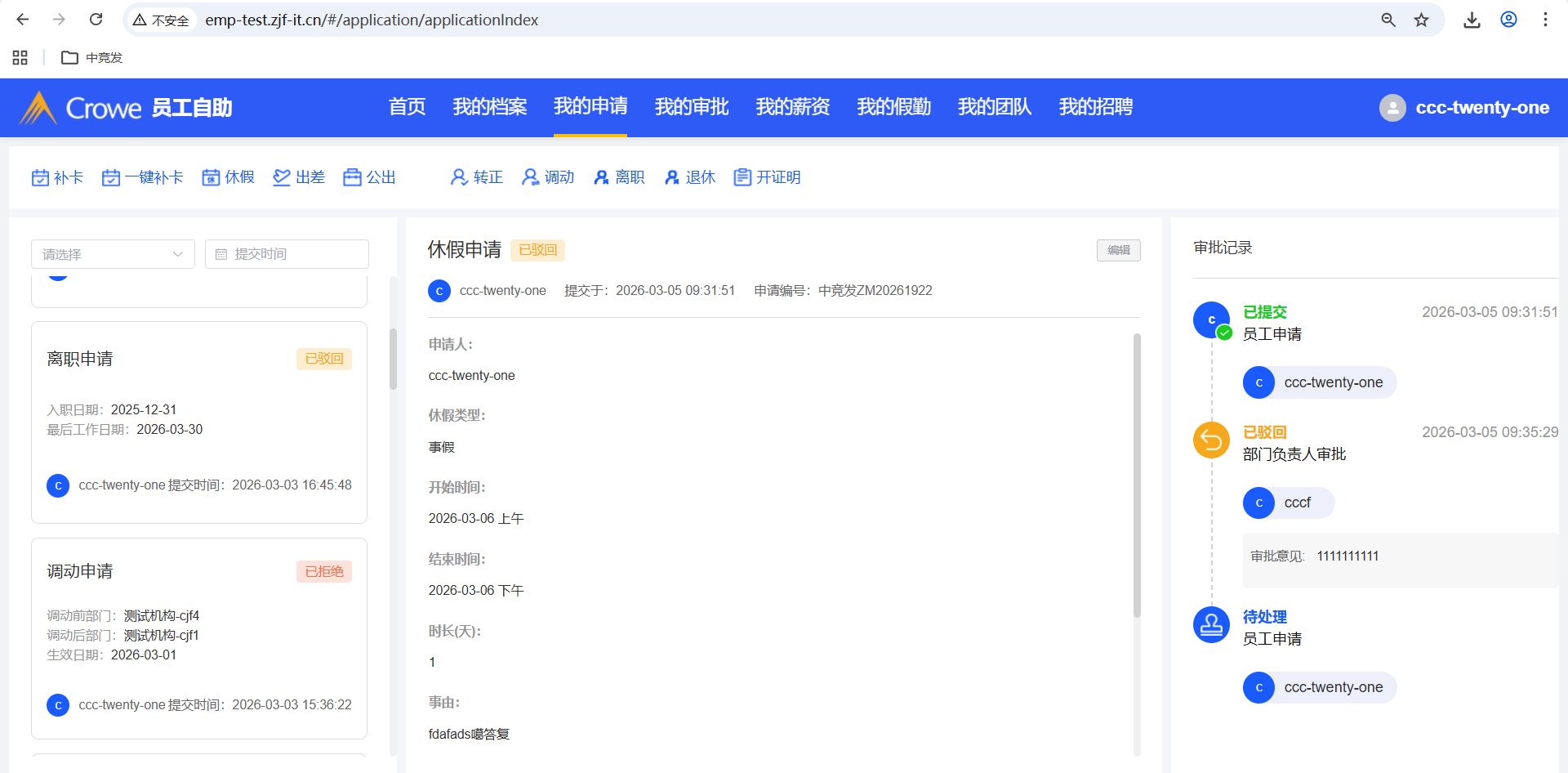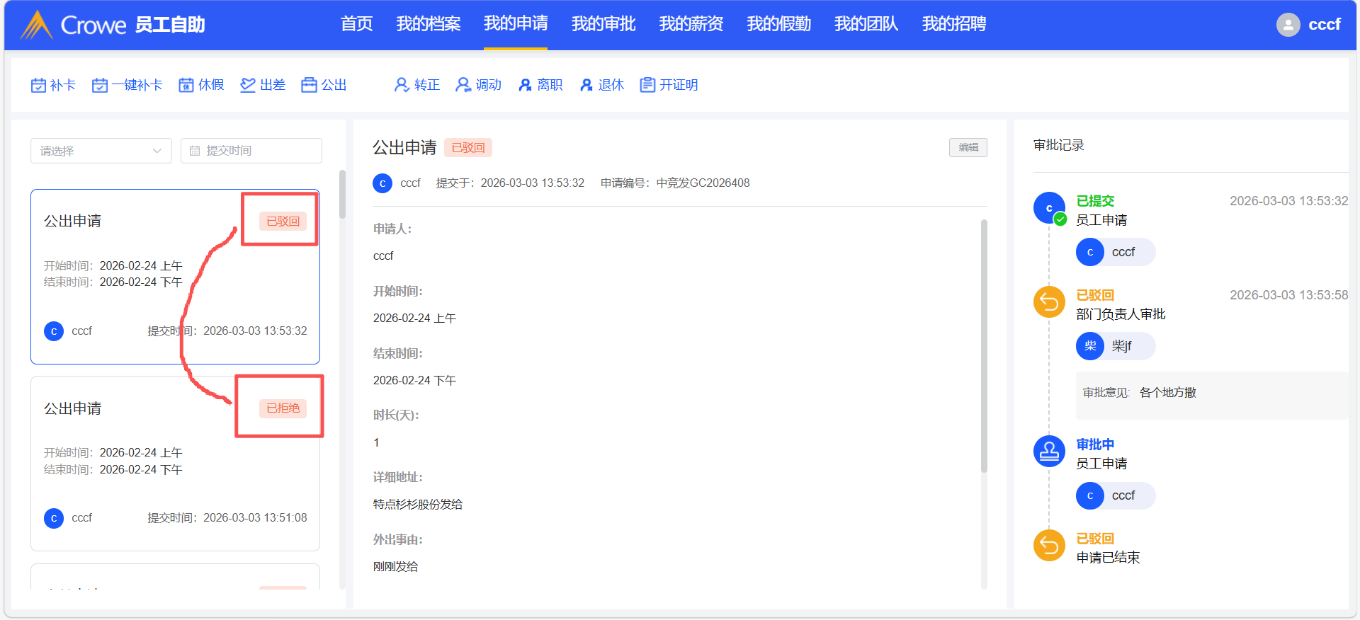 员工自助-我的申请,已驳回、已拒绝的icon一样,建议做区分