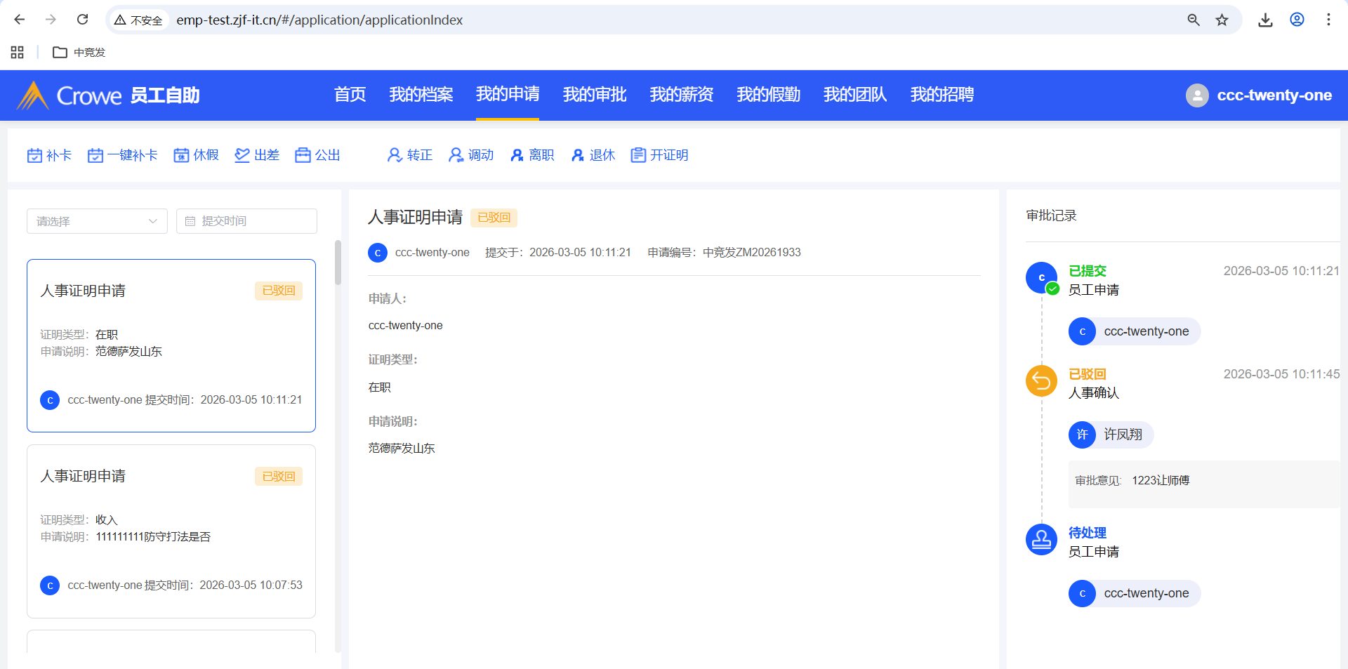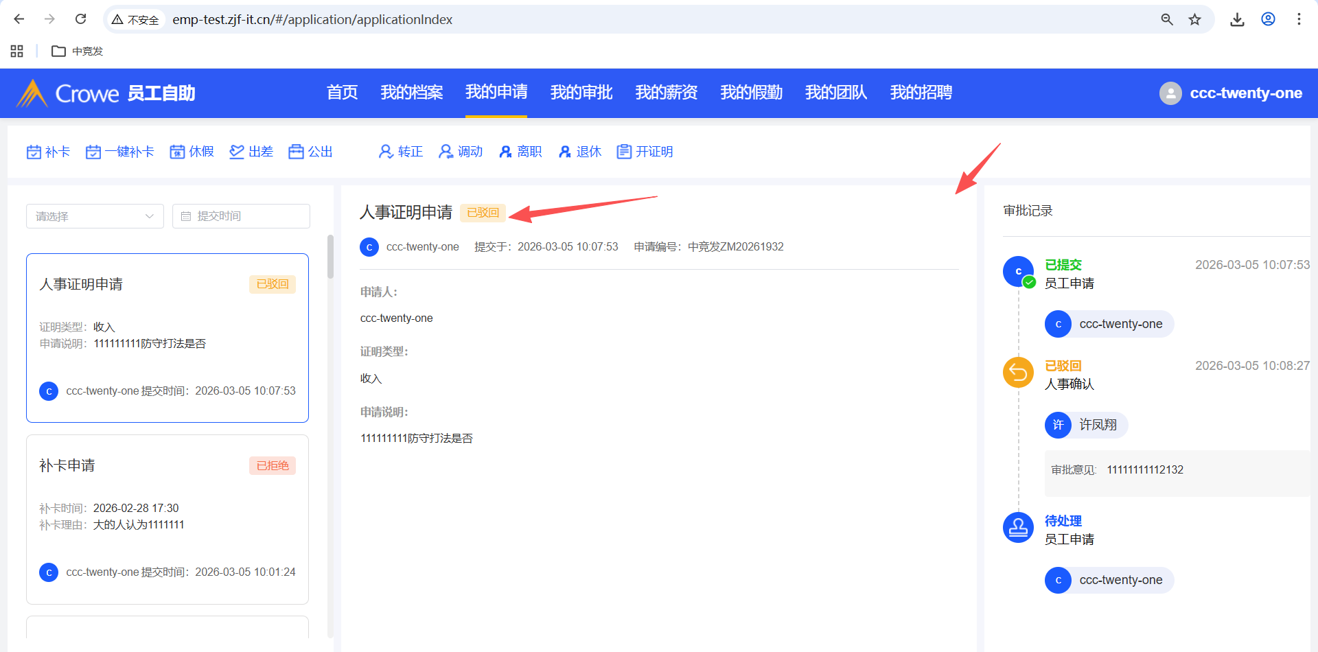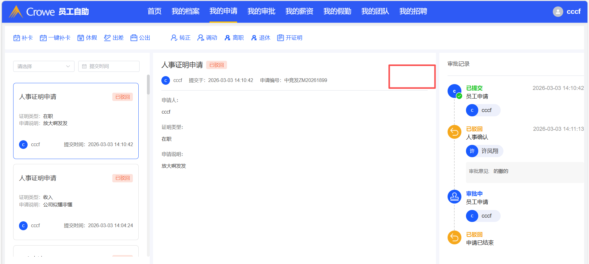 打开员工自助-我的申请,收入、在职证明申请,驳回后,缺少编辑按钮