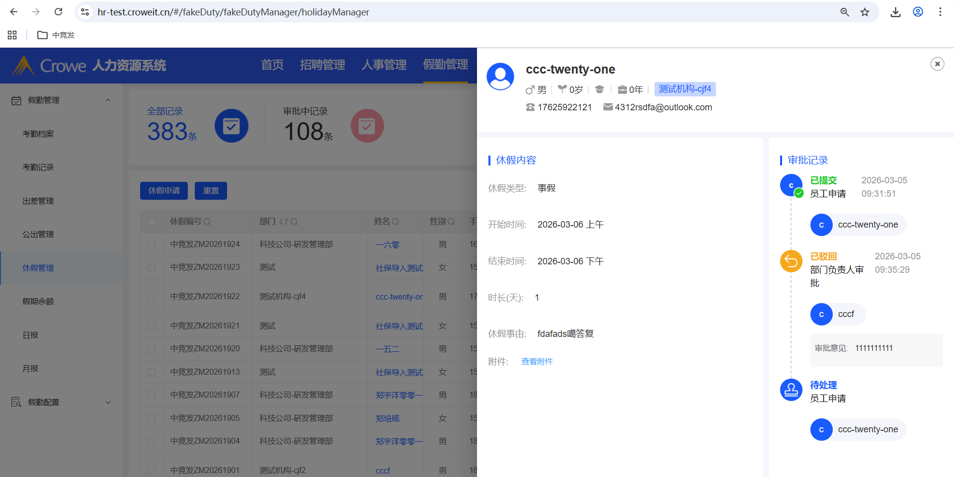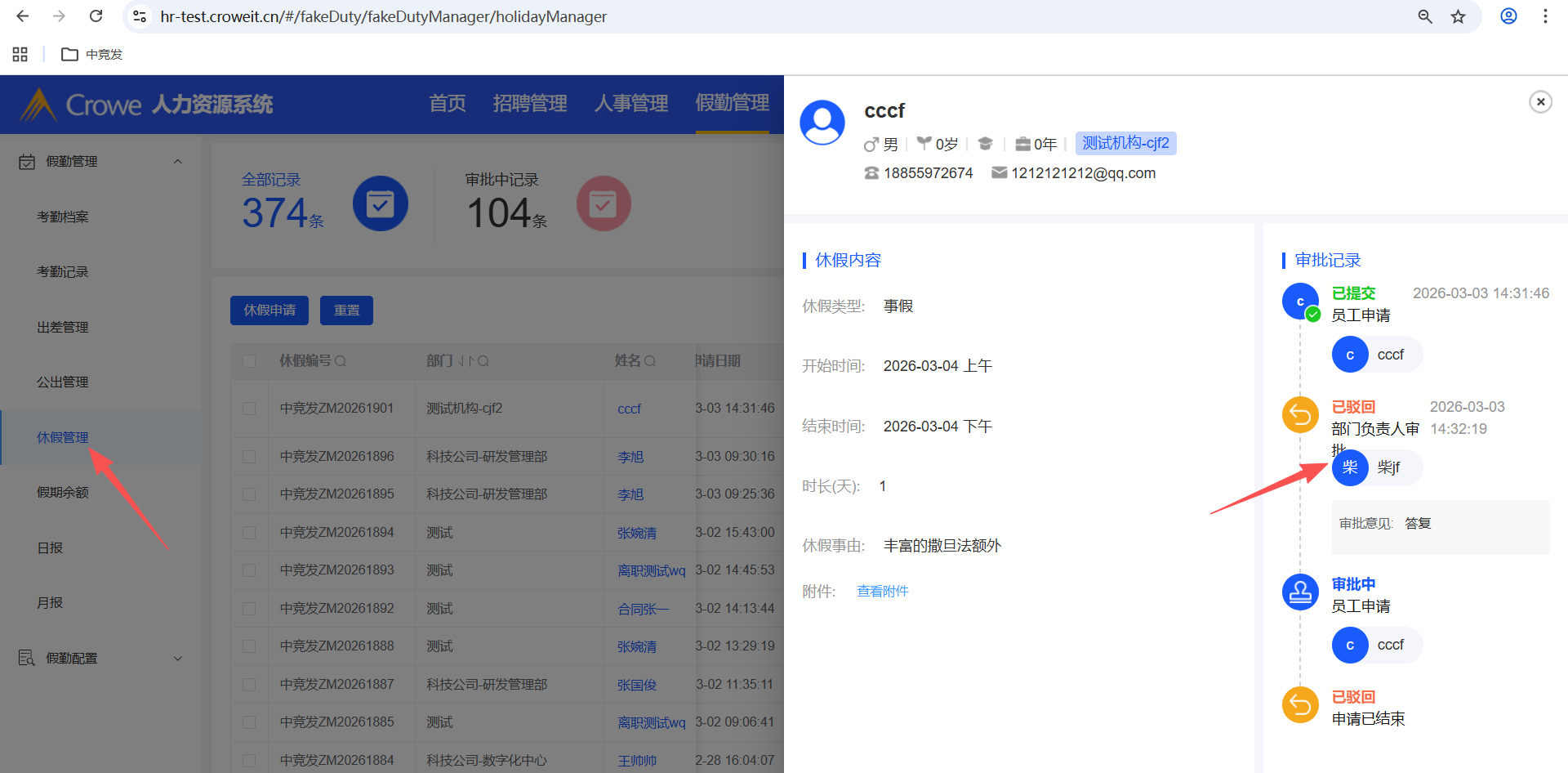 人力资源系统-假勤管理-休假管理,休假详情的审批记录存在文字遮挡