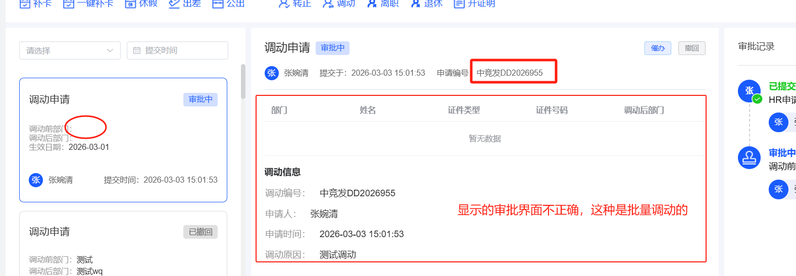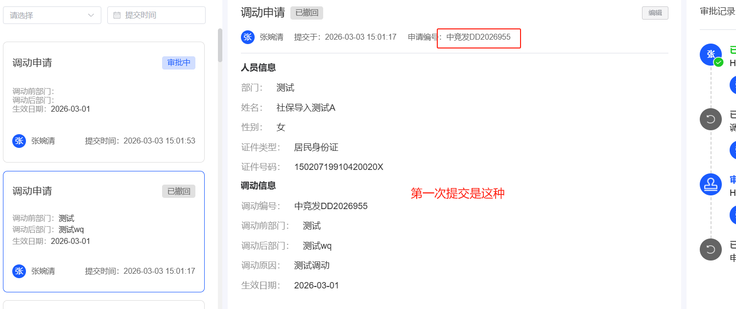 人事管理-调动管理-单人调动:撤回再提交,员工自助显示的审批界面不正确