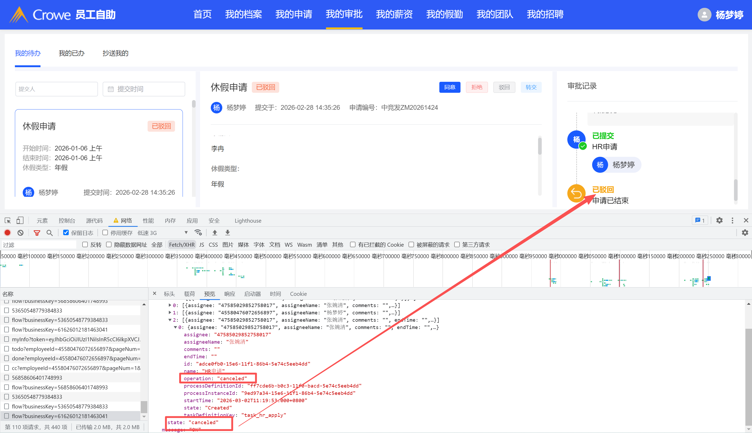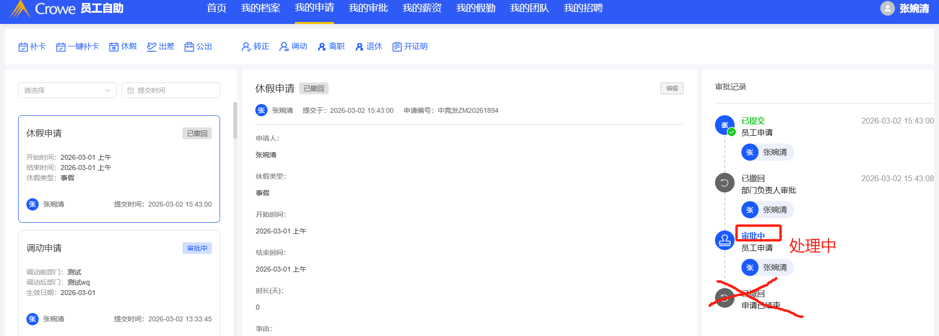 员工自助-撤回/驳回:1、撤回后仍有个审批中的记录 2、撤回后流程还可以再发起编辑,末尾的已结束不用展示