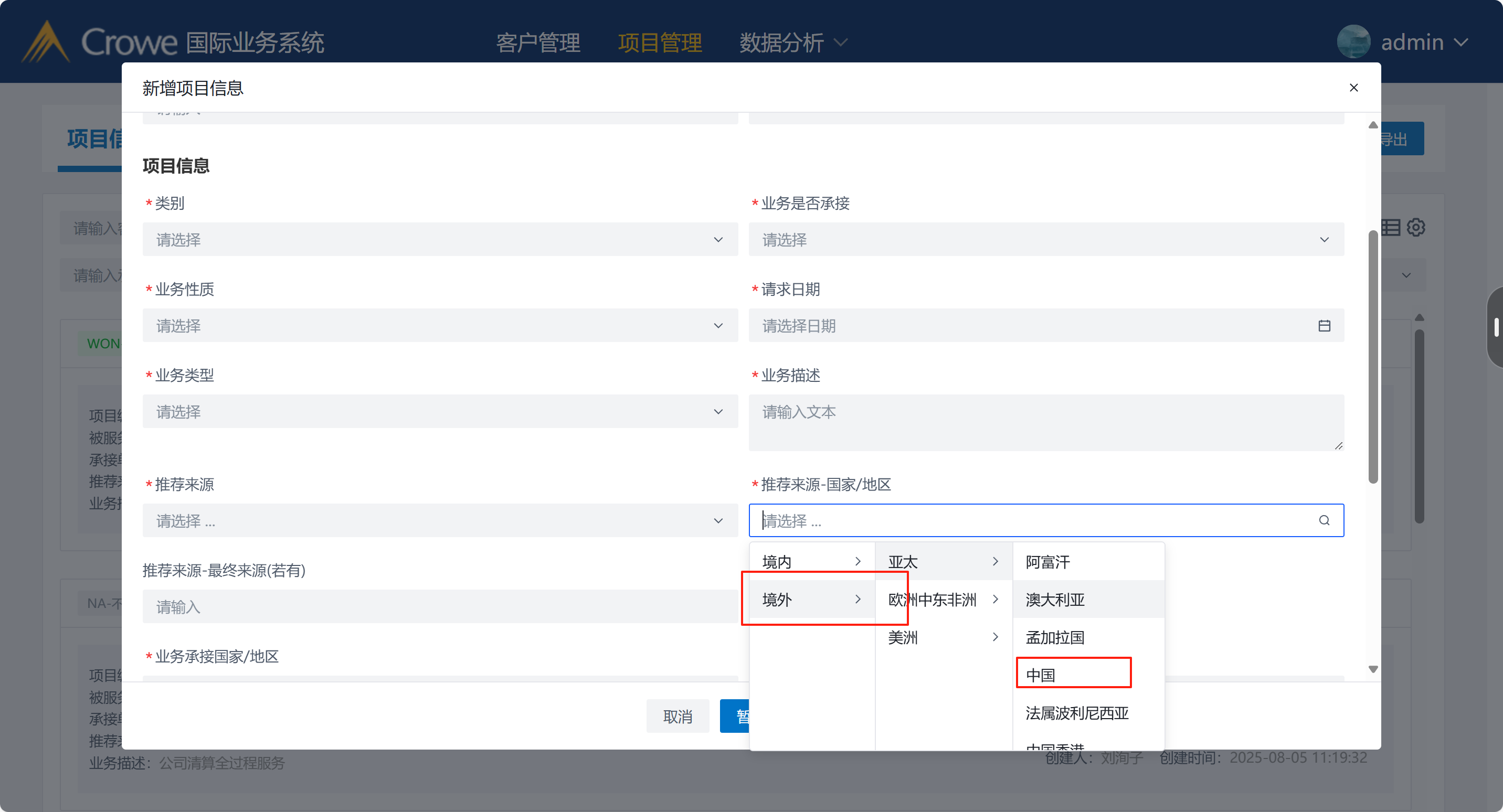 推荐来源-国家/地区下拉框中,境外的亚太国家出现中国