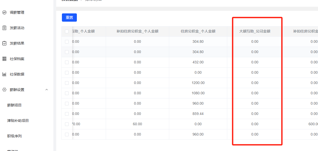 薪酬福利管理-社保数据:大额互助_公司金额一列为0