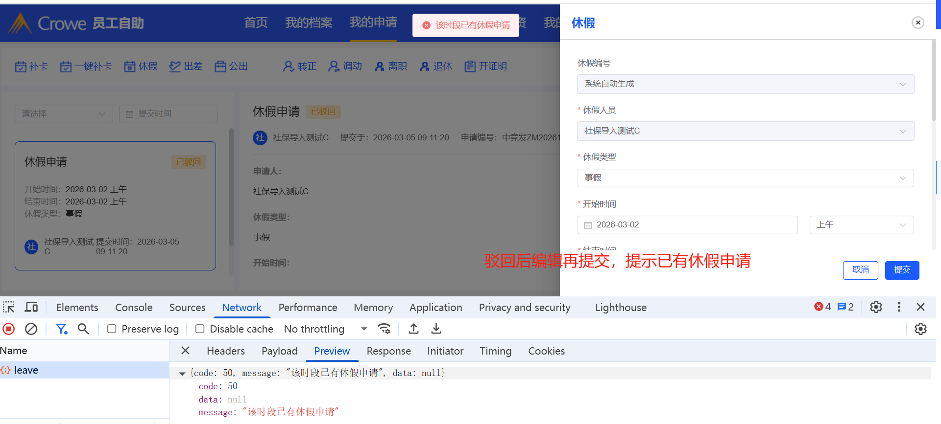 员工自助-驳回:休假申请驳回后再次提交,提示该时段已有休假申请