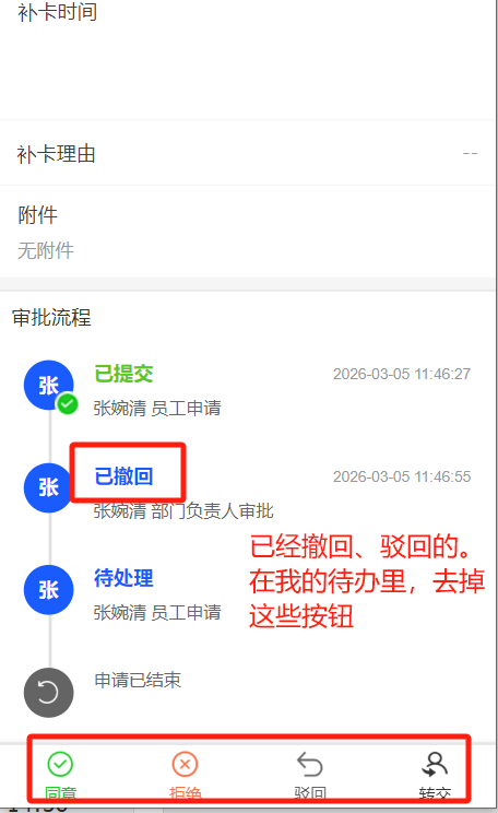 小程序:撤回、驳回的操作,在我的待办里需要去掉同意、拒绝等操作按钮