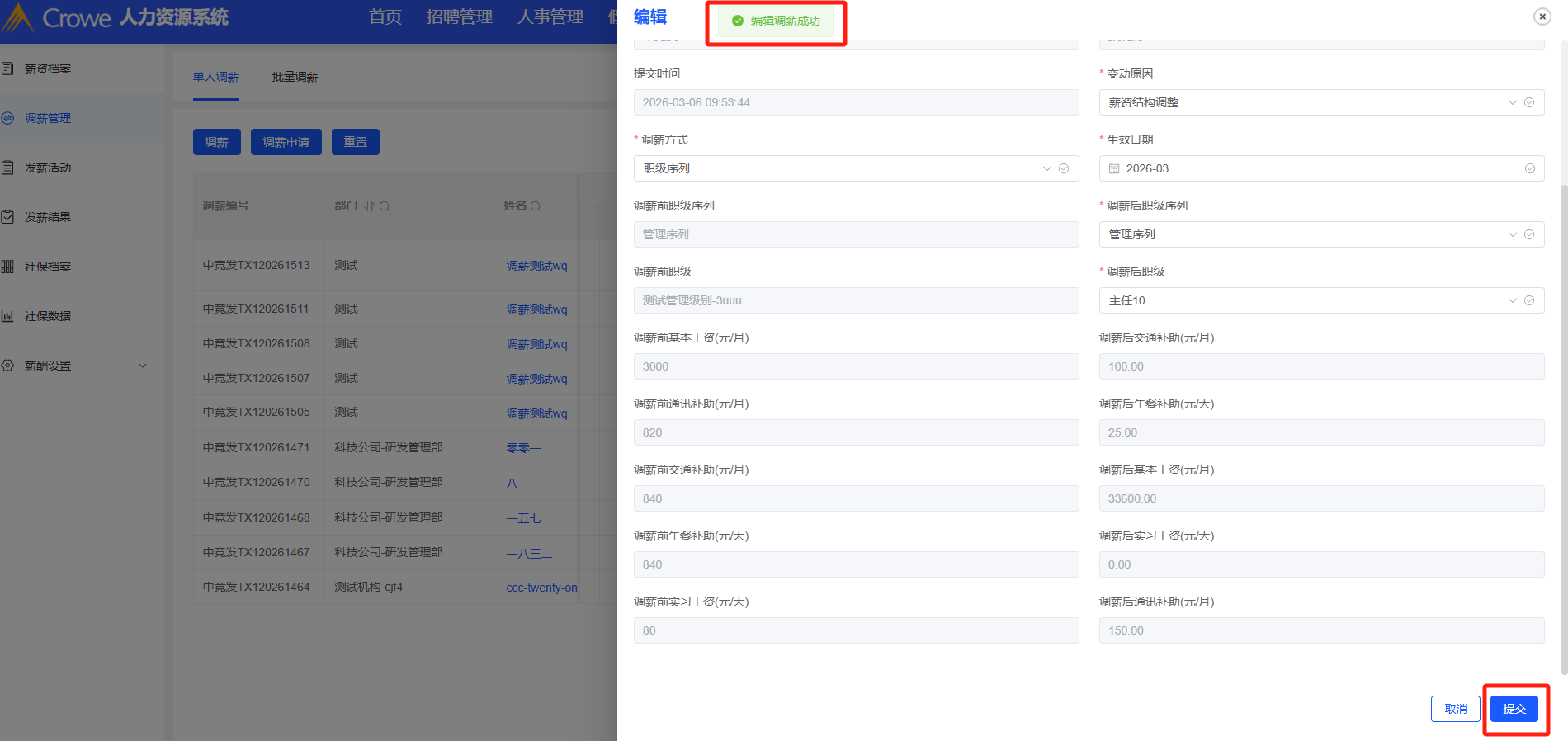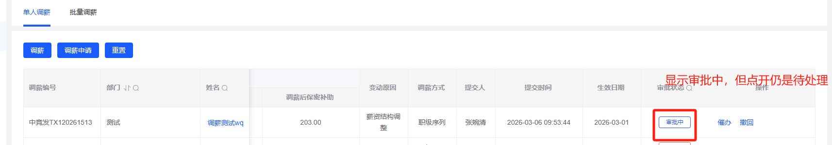 薪酬福利管理-调薪管理-单人调薪:撤回后再编辑提交,1、显示编辑成功但页面未关闭;2、返回列表审批状态仍显示已撤回 3、刷新页面审批状态变为“审批中”但实际并未发起审批