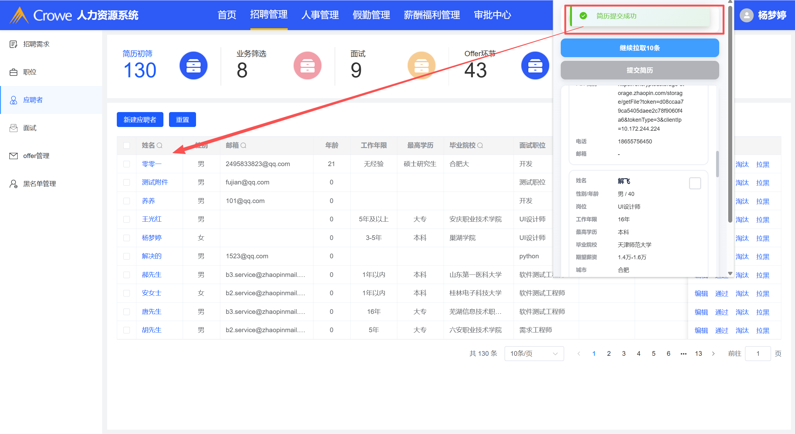获取简历成功后,自动初始化应聘者列表,加载出获取的应聘者信息