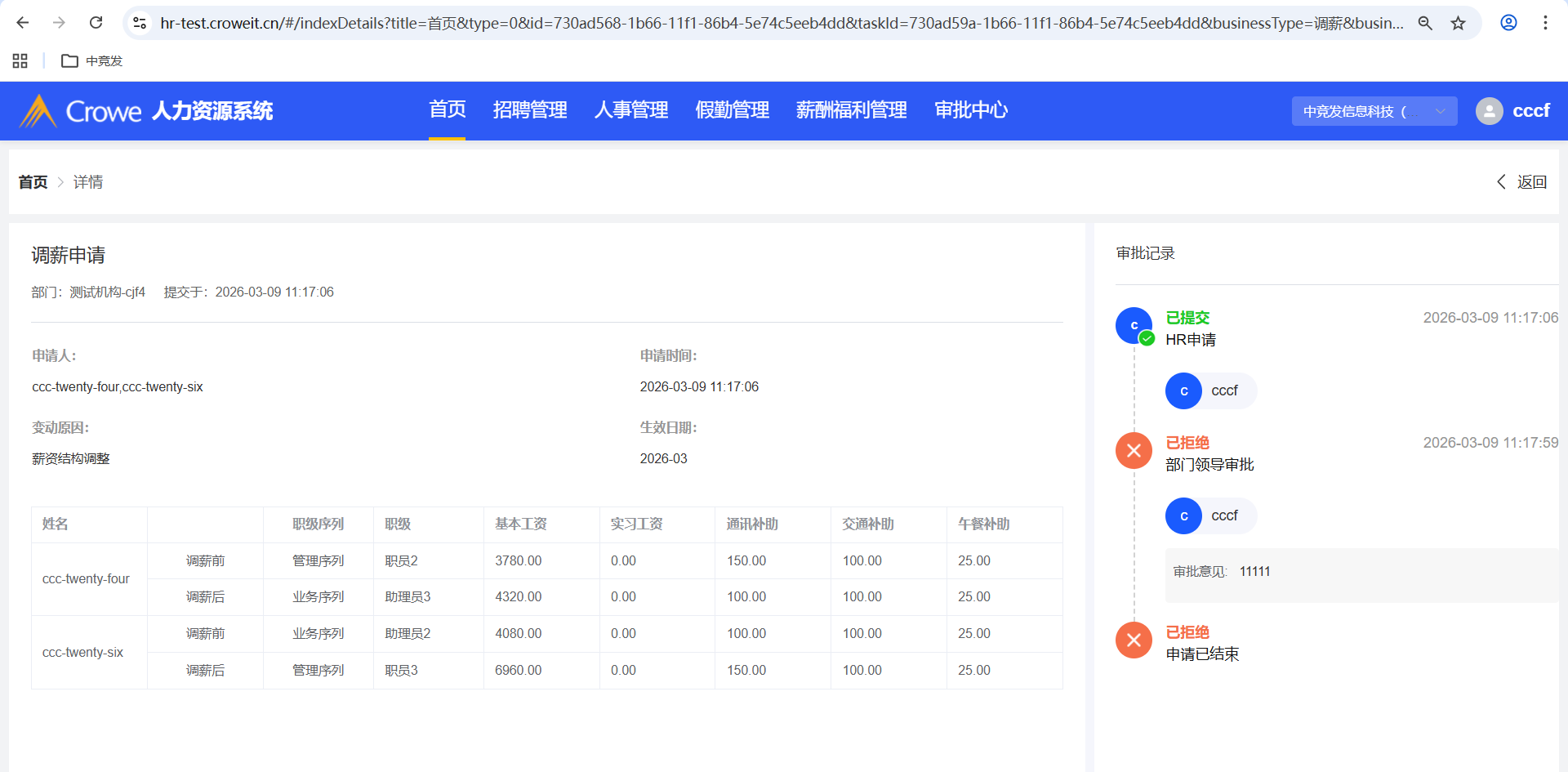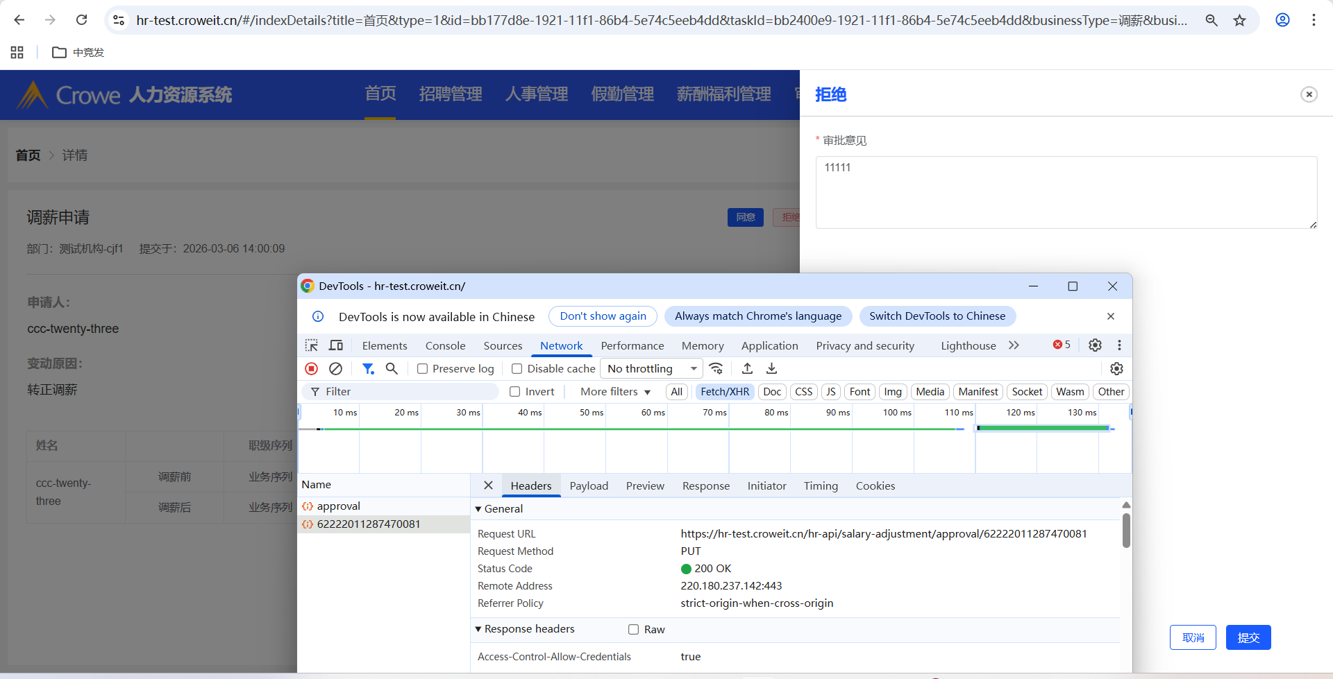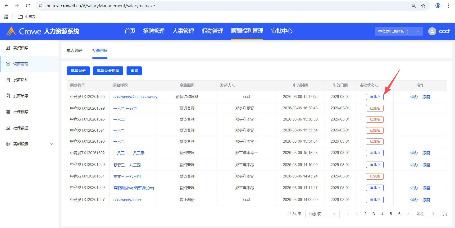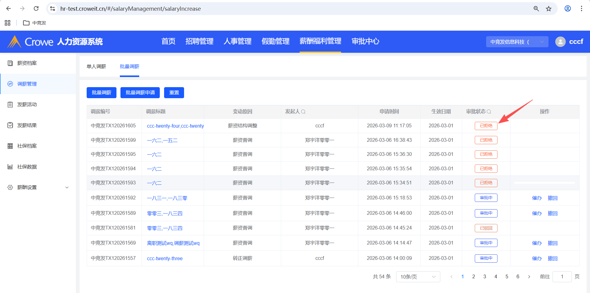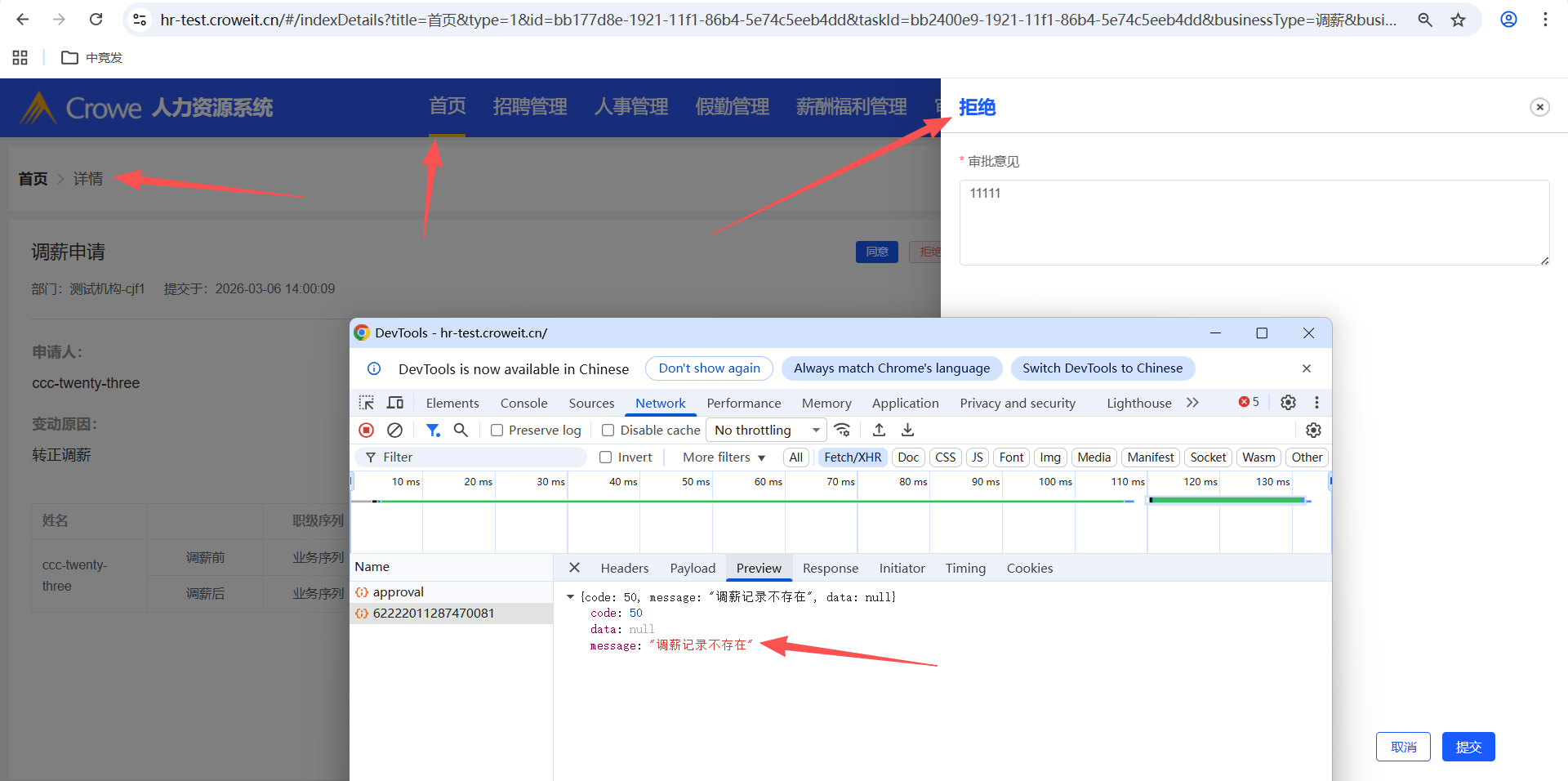 人力资源系统-薪酬福利管理-调薪管理,批量调薪申请后,人力资源系统首页拒绝,报错