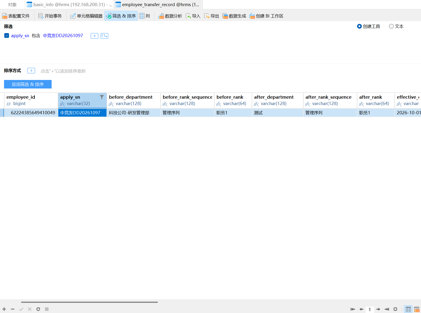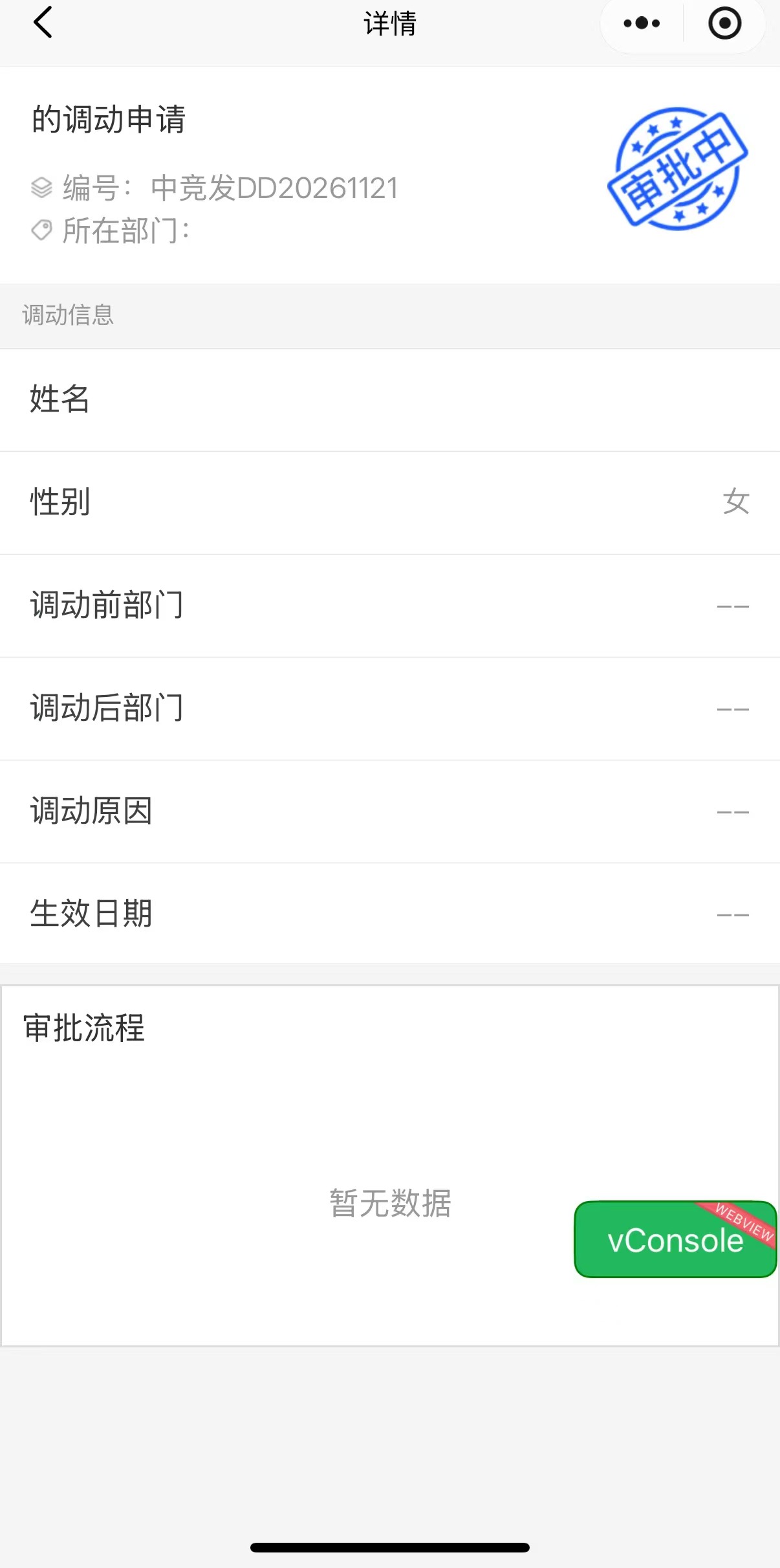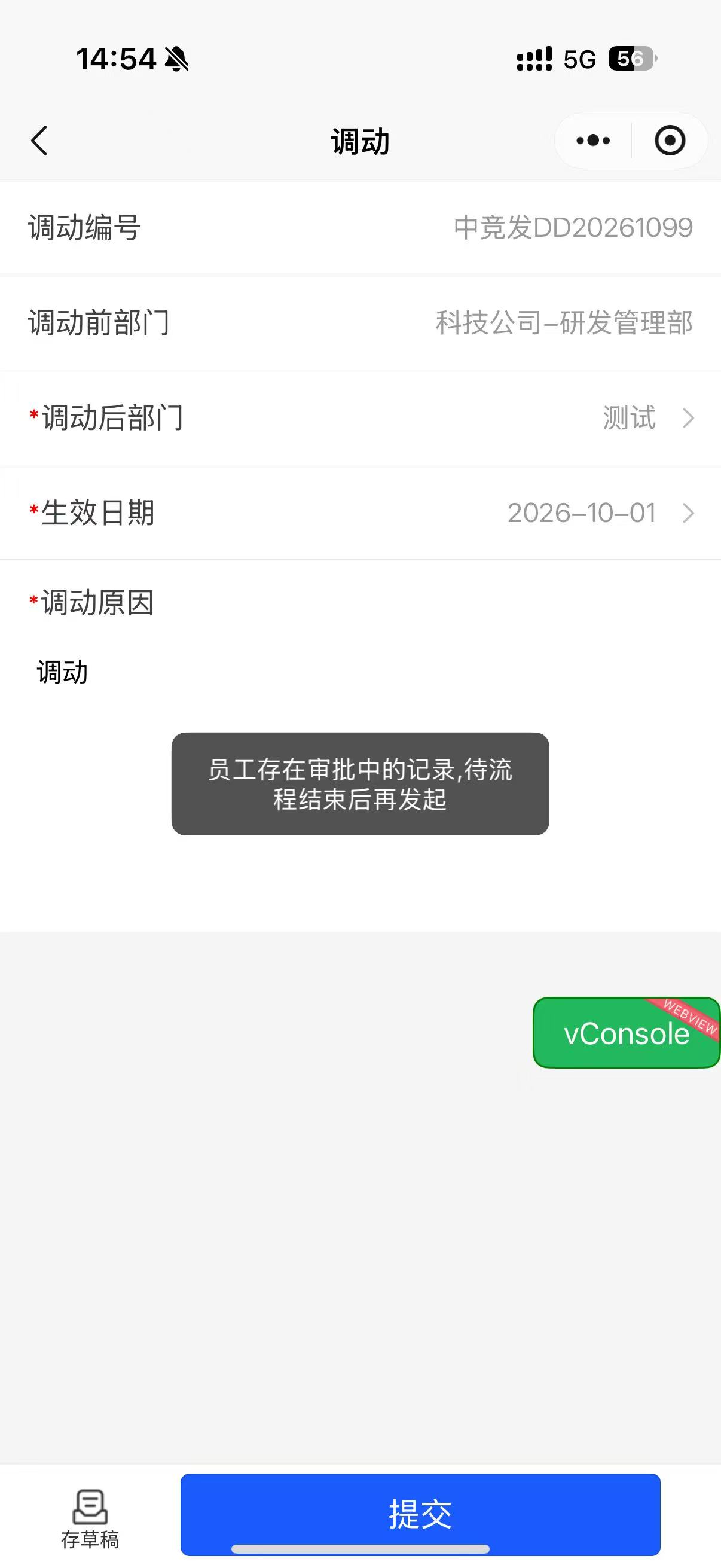 打开员工在小程序发起调动,提交后找不到我的申请表单,但不能再次发起调动申请