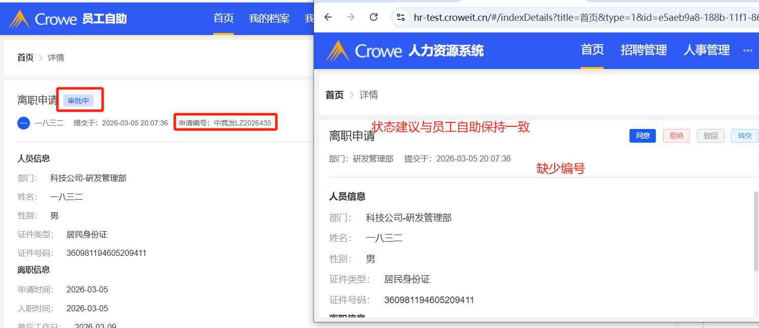 人力资源系统-首页:从首页点击进入1、编号缺失 2、审批中等状态显示建议与员工自助保持一致