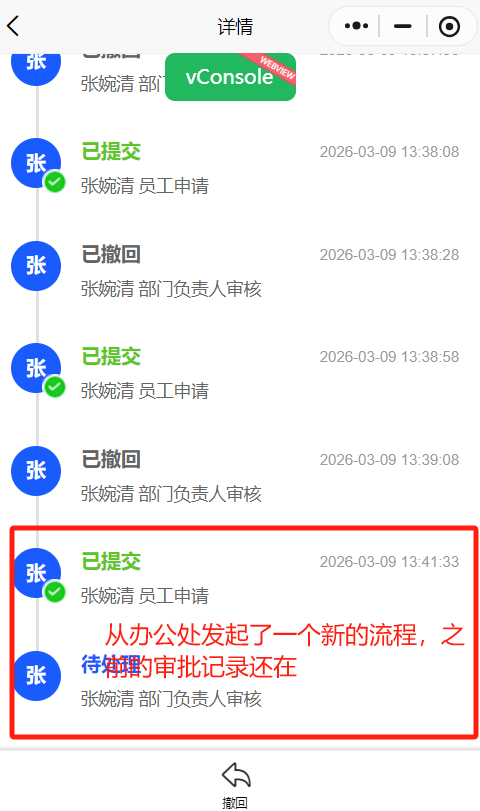 小程序-转正:撤回/驳回后的流程,从办公页面再发起转正流程,审批流程里的记录不用接着之前的