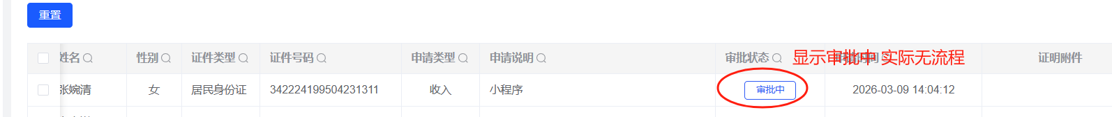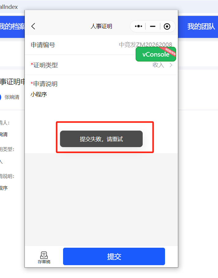 小程序-人事证明:撤回驳回后再次编辑提交,提示提交失败,人事侧列表中显示审批中