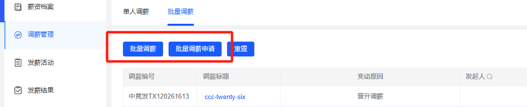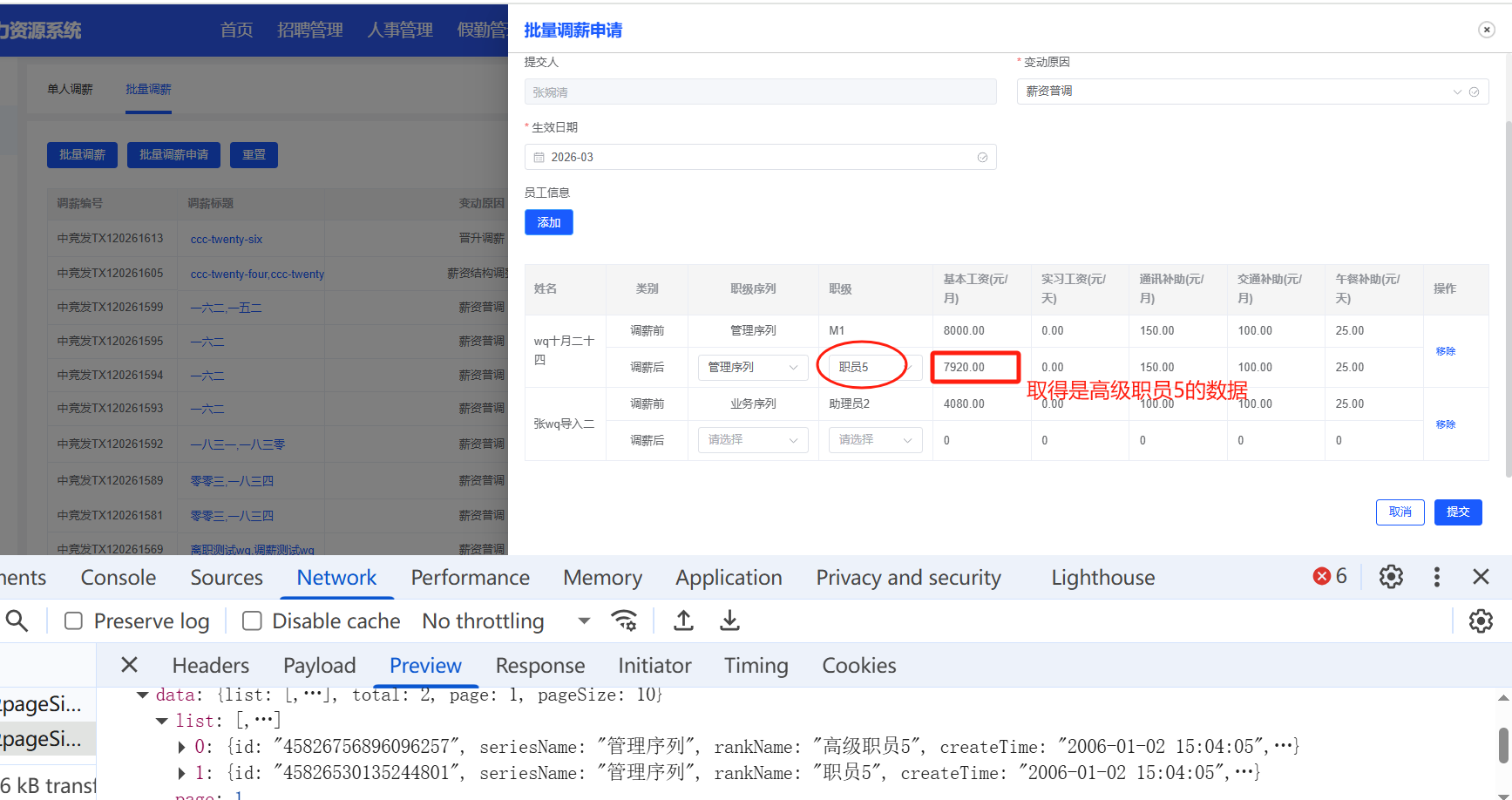已关闭薪酬福利管理-调薪管理:批量调薪/批量调薪申请:调薪后选择职员5,显示的是高级职员5的薪资数据