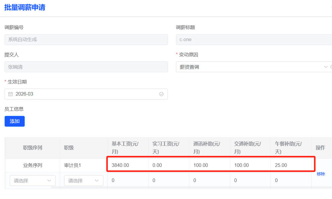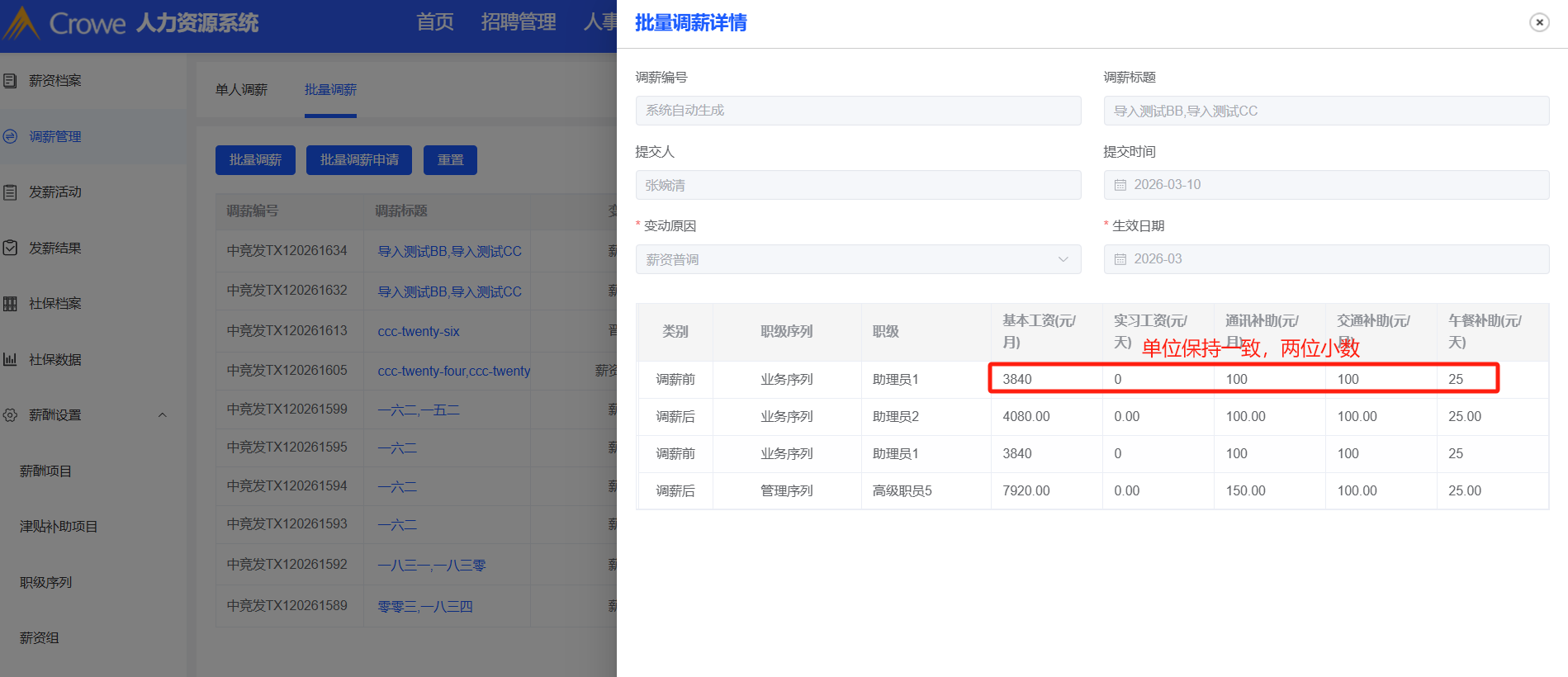 薪酬福利管理-调薪申请-批量调薪:点击调薪标题查看,调薪前的工资未保留2位小数