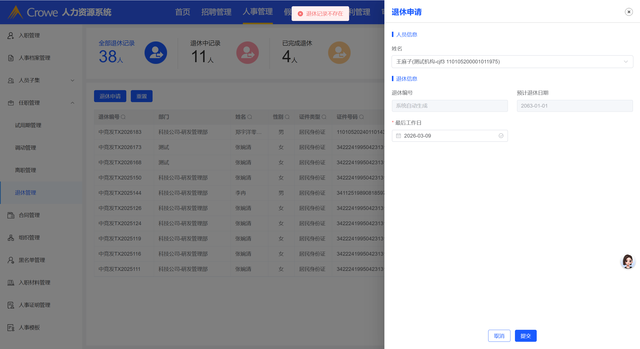合同管理:提交退休申请时,页面提示退休记录不存在