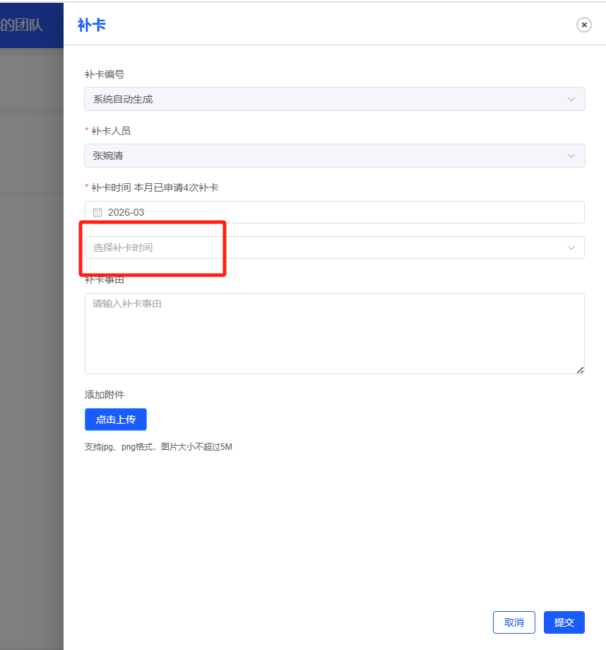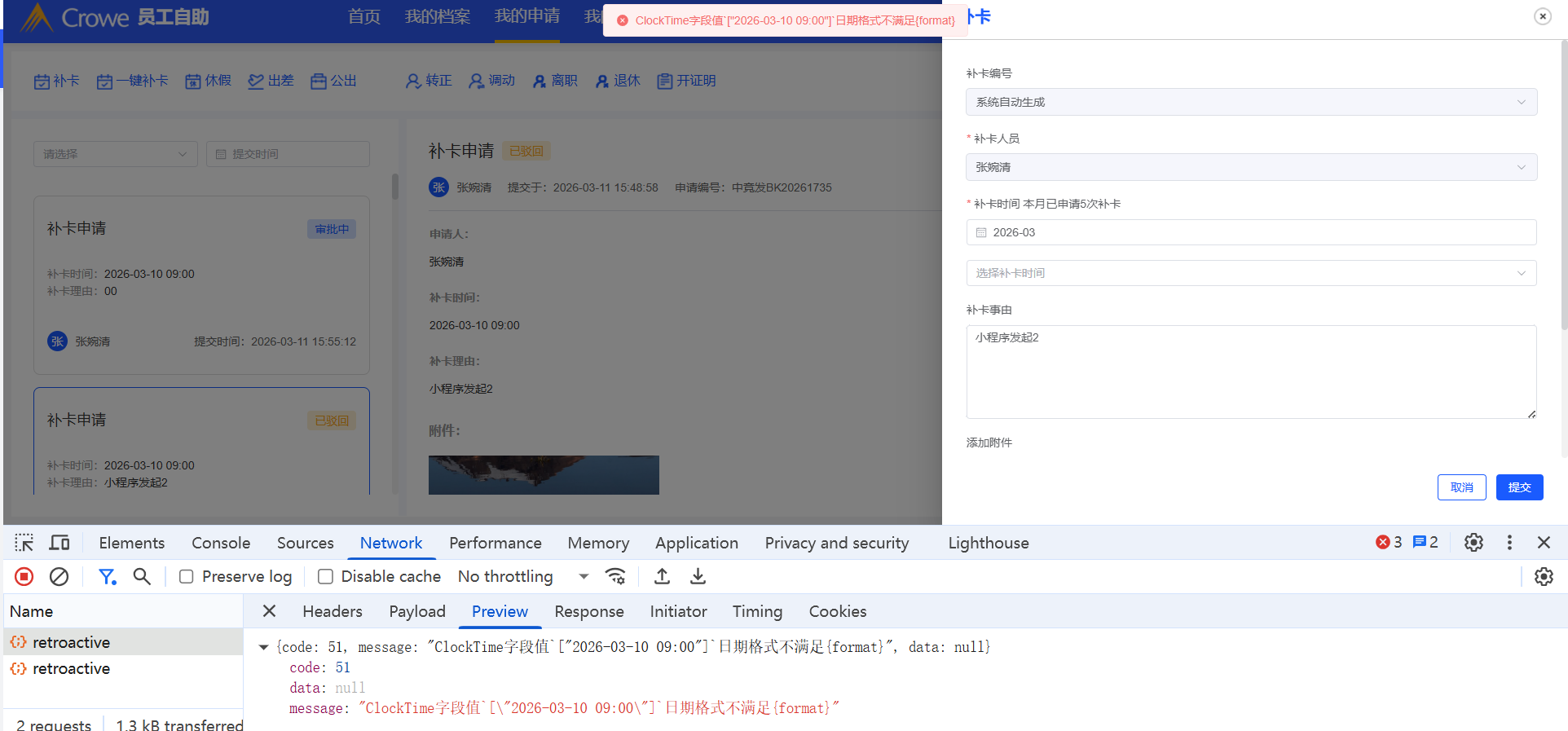 员工自助-补卡:有一个驳回的补卡,同一时间又重新发起了一个新的补卡申请,提示异常