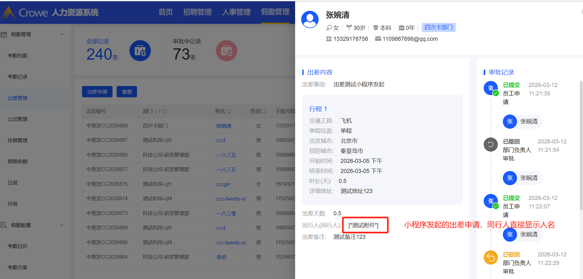 小程序-小程序发起的出差,同行人在假勤管理-出差管理中显示问题