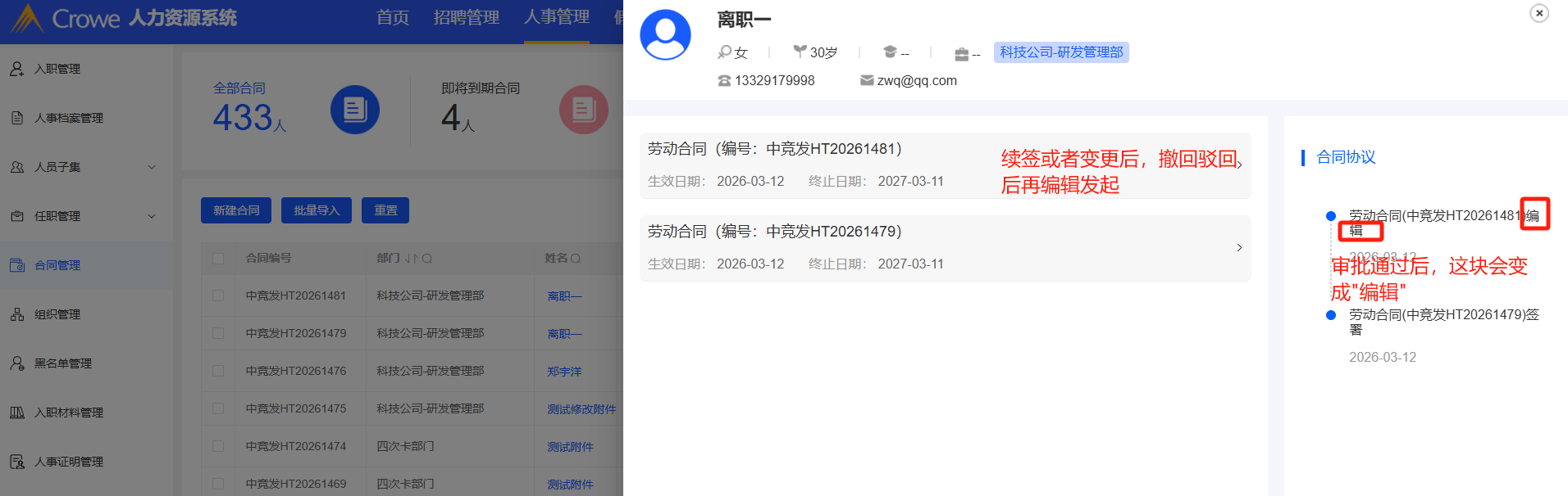人事管理-合同管理:点击姓名查看合同详情,经过撤回驳回后再编辑提交的合同,右侧合同协议中显示“编辑”
