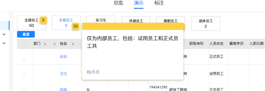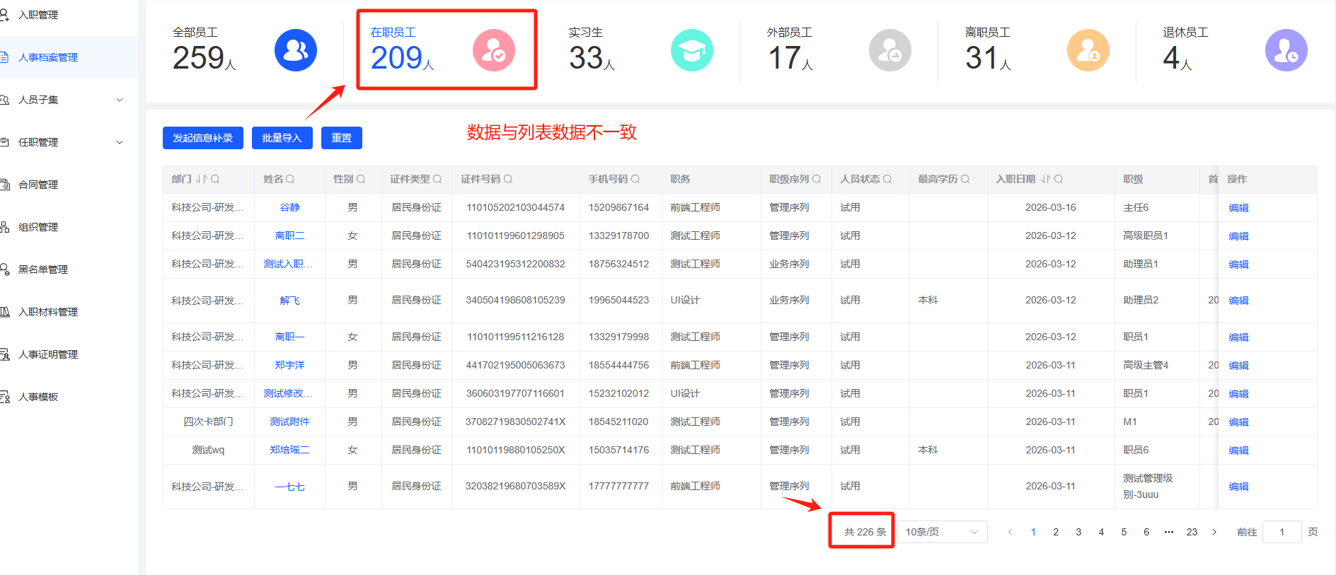 人事管理-人事档案管理:在职员工数据显示数据与列表显示数据不一致