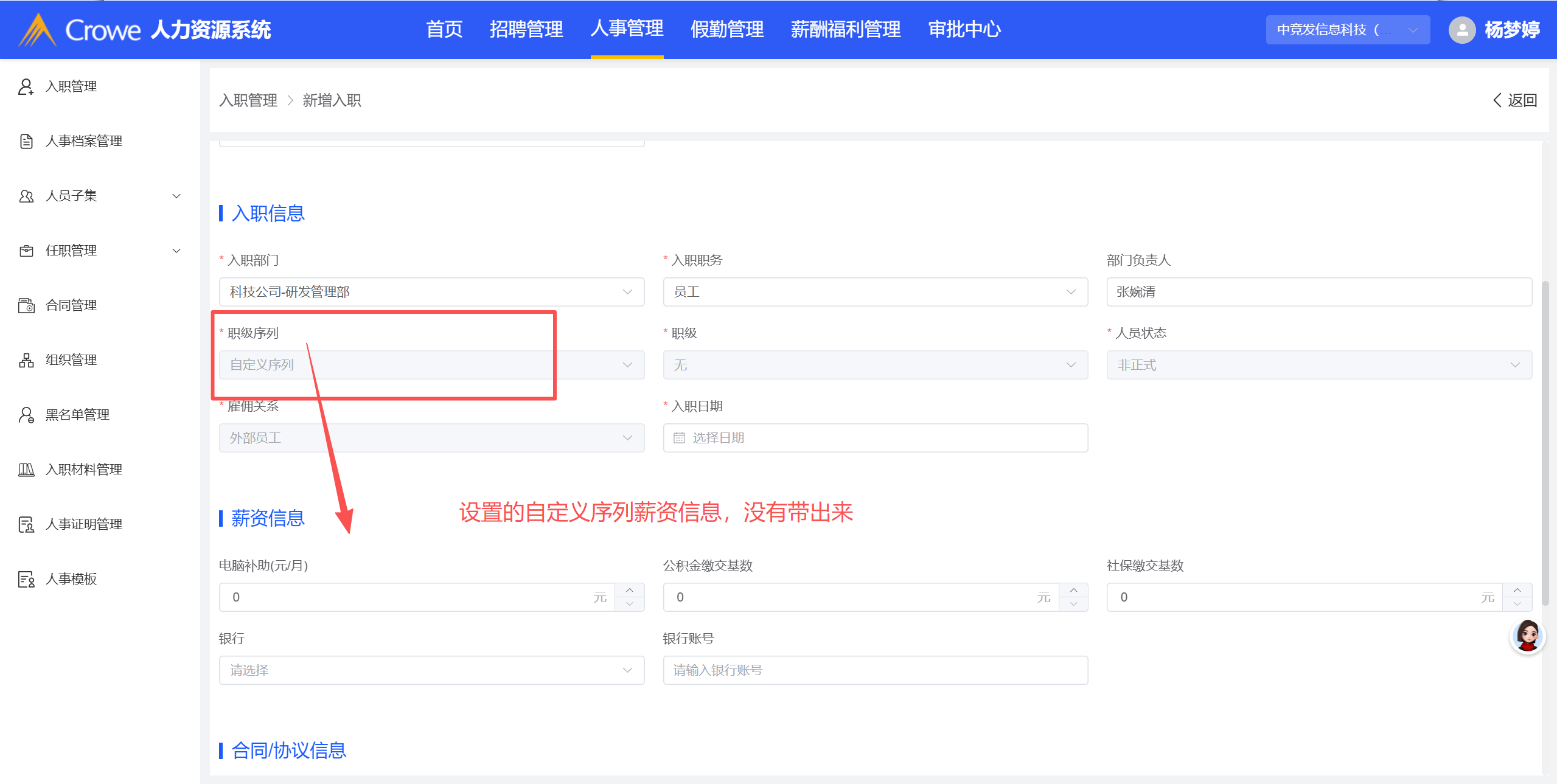 自定义序列配置的职级项目字段,在新增外部人员表单中,薪资信息没有回显配置的发薪项目