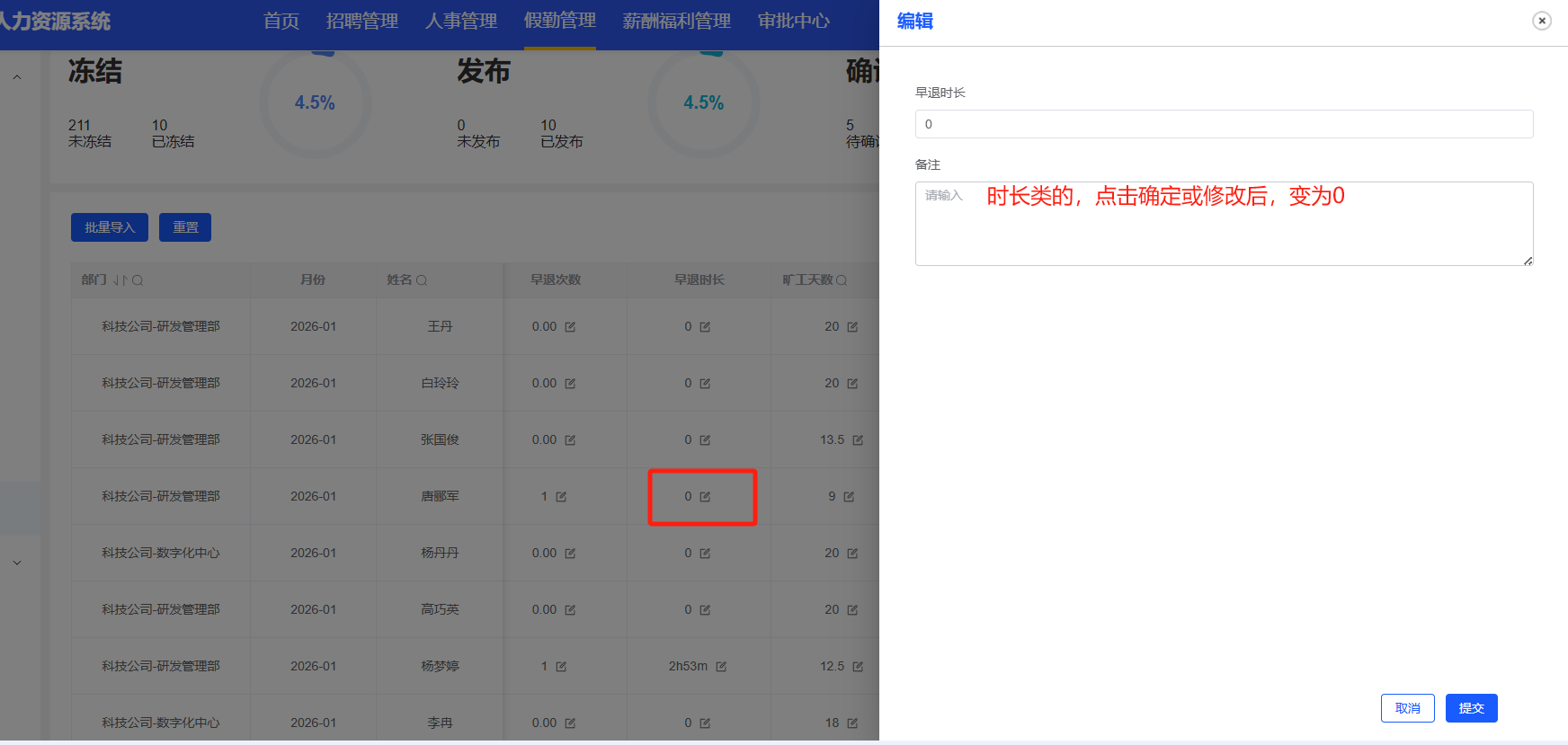 假勤管理-月报:早退时长、迟到时长等时长类,编辑后显示为0