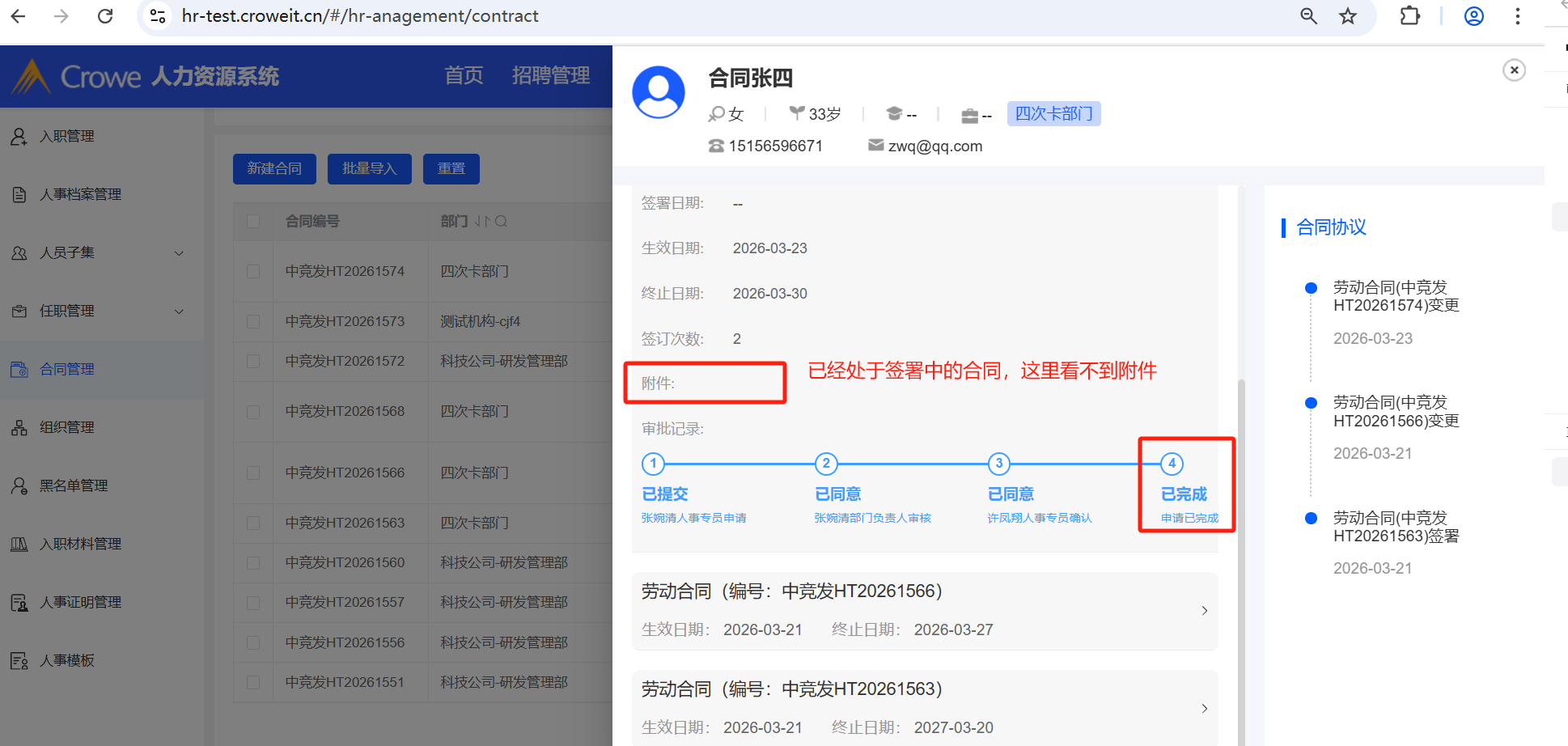 人事管理-合同管理:签署中的合同,人事在合同管理中看不到合同数据