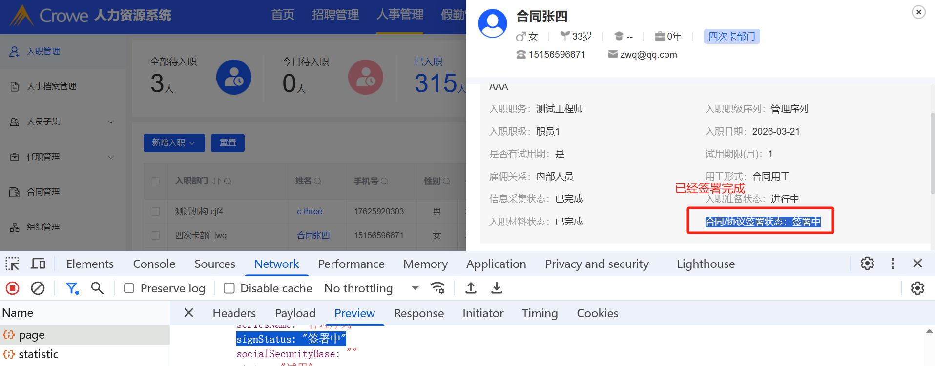 人事管理-入职管理:合同已经签署成功,入职管理中点击姓名查看基本信息,合同仍在签署中