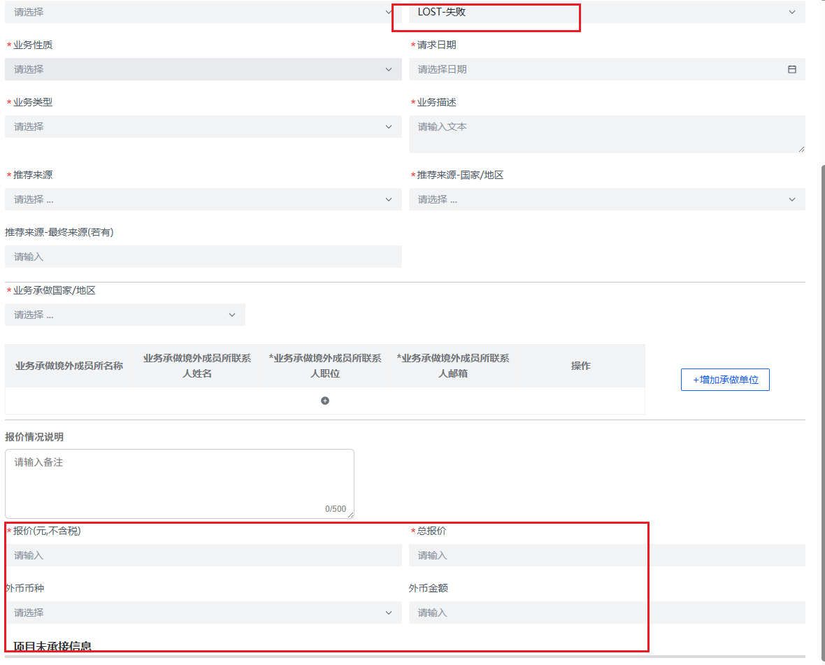 2.业务是否承接选择了“LOST-失败”,缺少字段