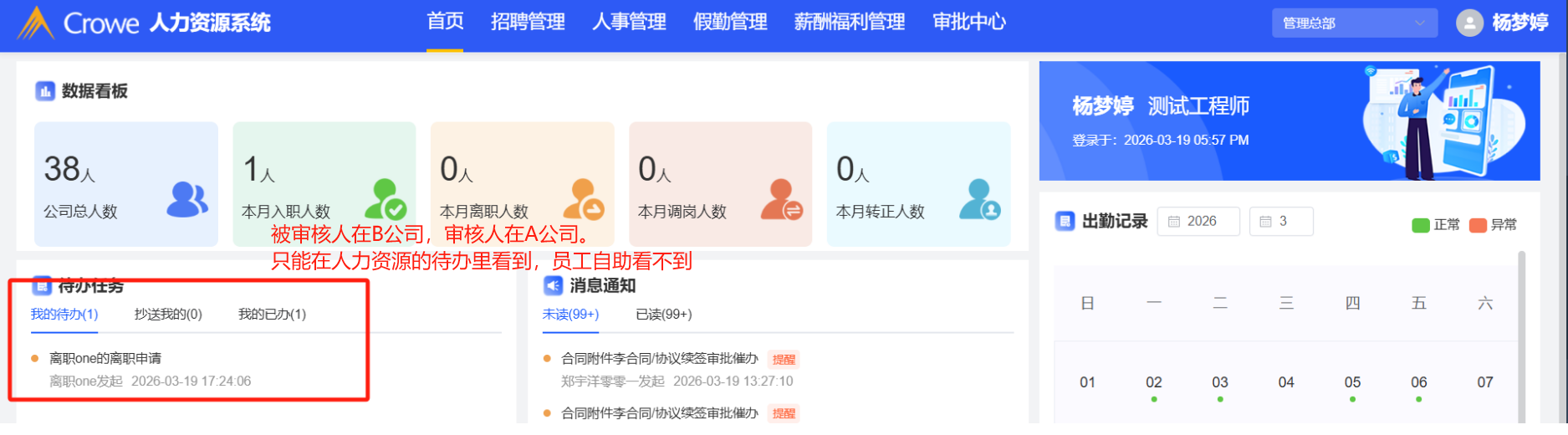 员工自助:跨公司审核,被审核人在B公司,审核人在A公司,审核人在员工自助的待办里看不到该待办,只能在人力资源系统的首页才能看到