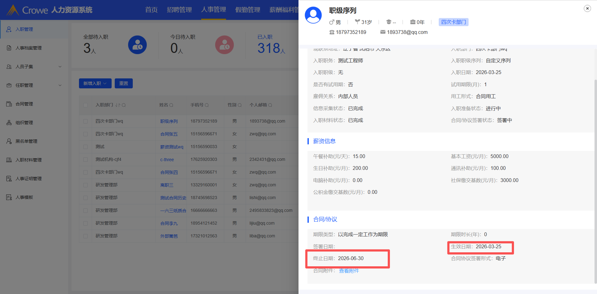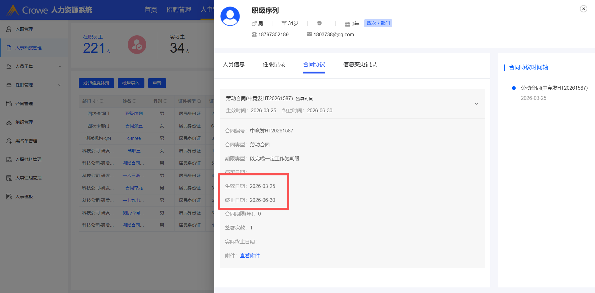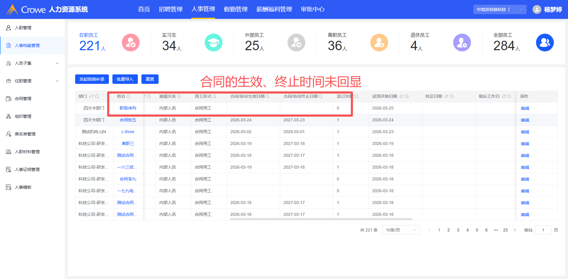 新增自定义序列的员工,合同管理列表未回显合同的生效、终止时间