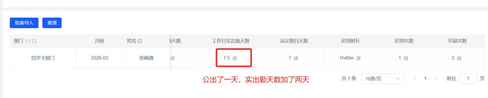 四次卡-公出申请提交了1天,实出勤天数增加了2天