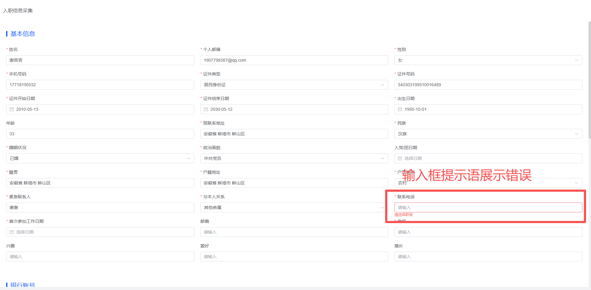 招聘管理:入职采集表单中,紧急联系人的联系电话字段提示语展示错误