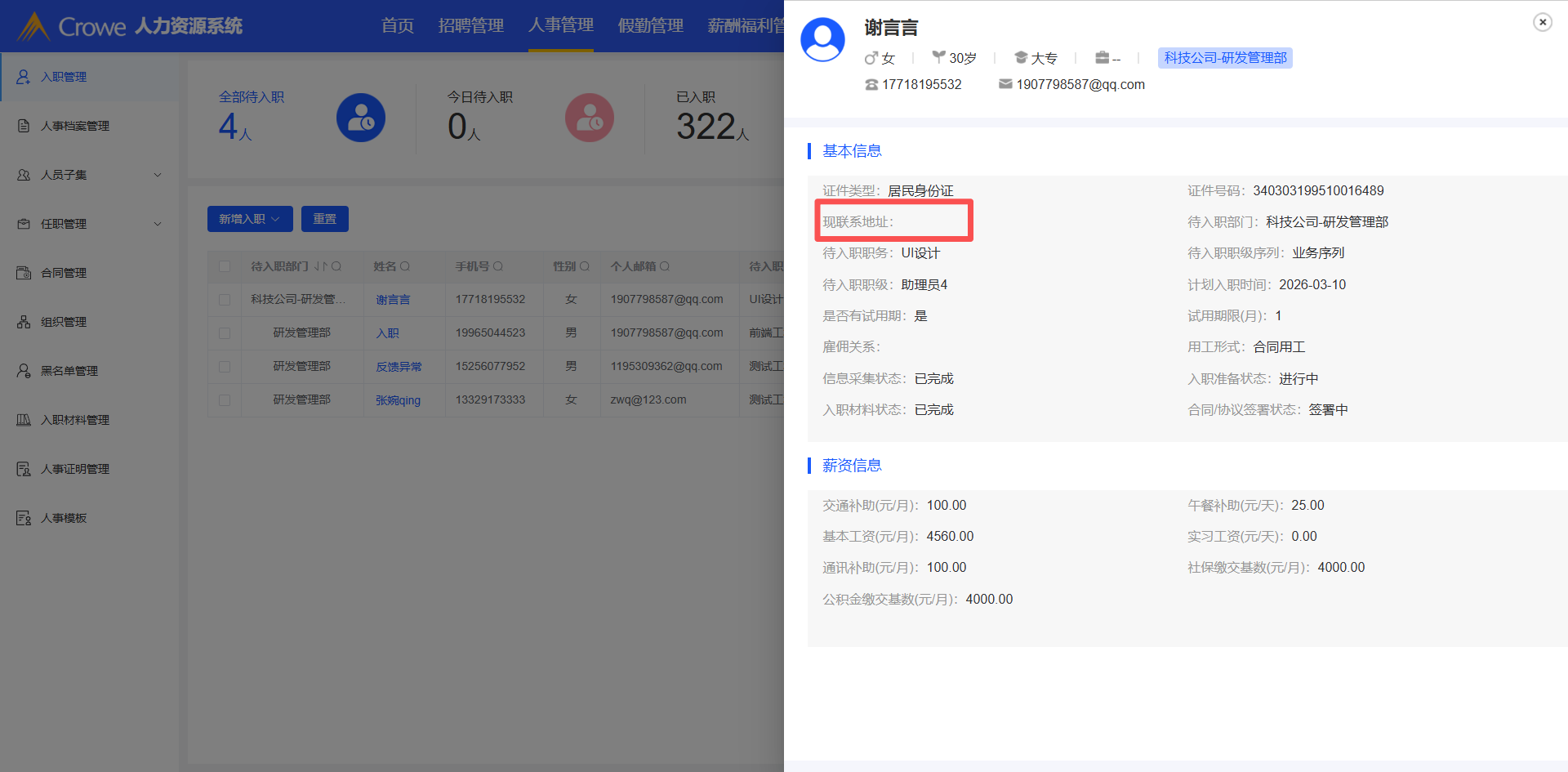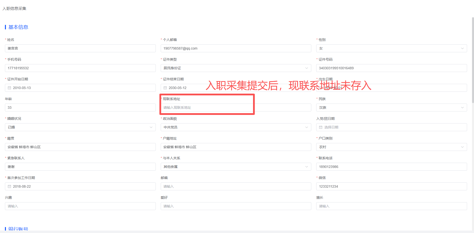 招聘管理:入职采集未传入现联系地址数据,待入职详情页现联系地址未回显