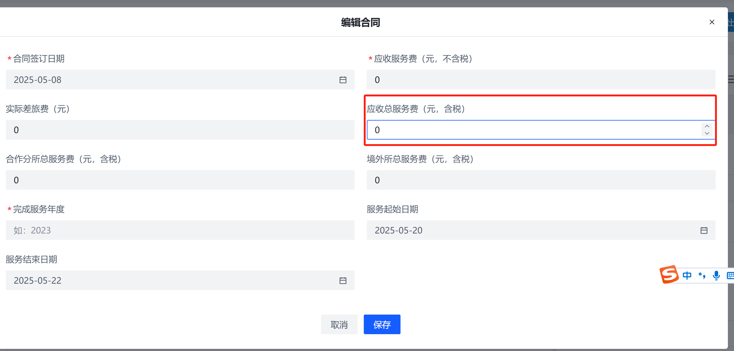 编辑合同中,应收总服务费是必填项