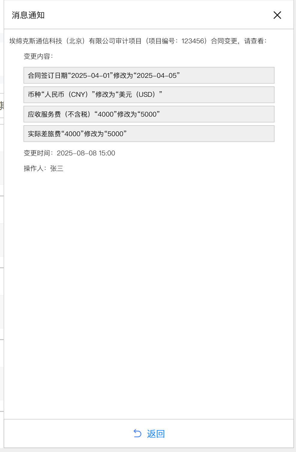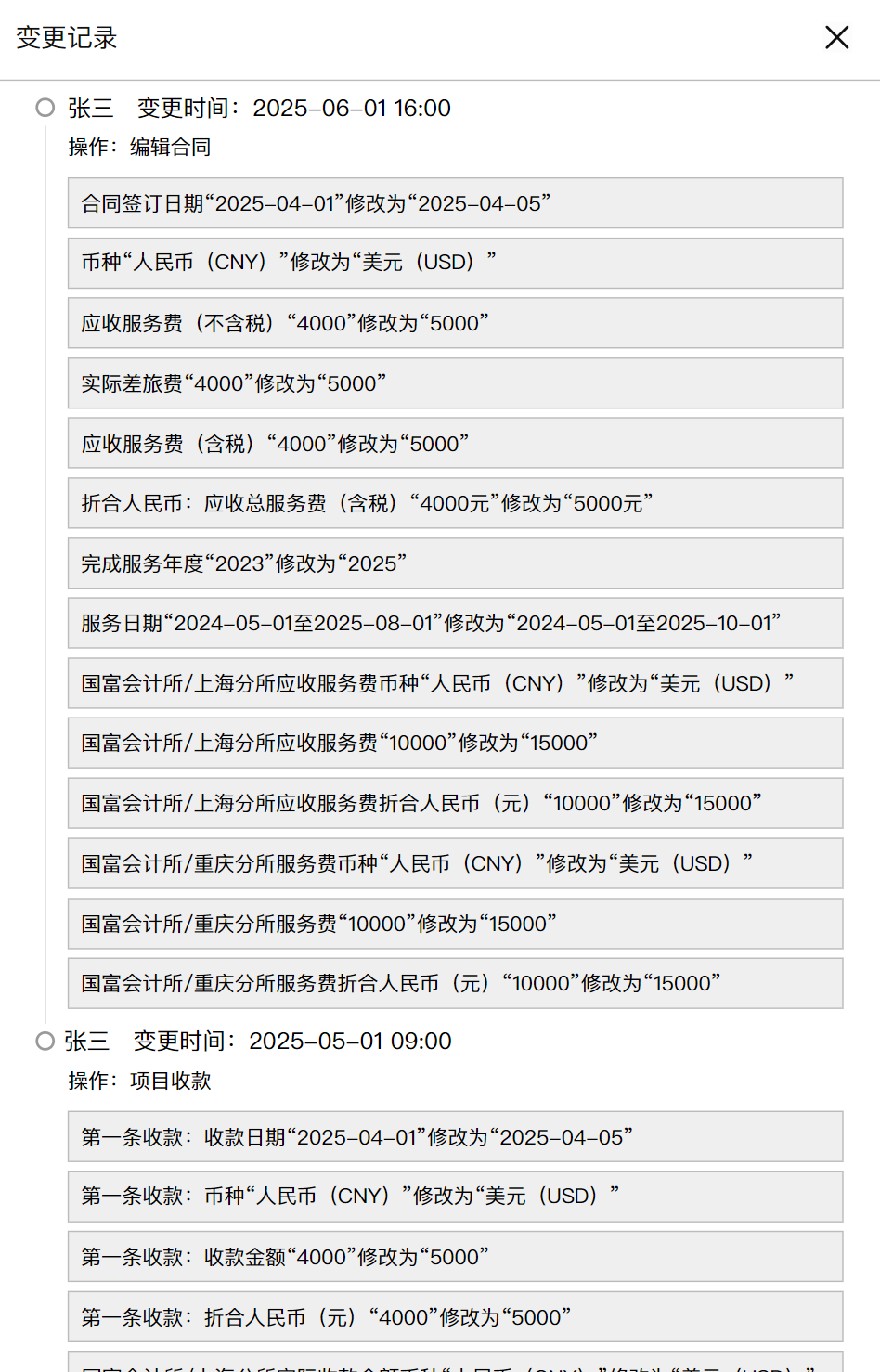 1.项目管理增加“变更记录”,只记录合同,收款变更,需要记录变更的字段看图二内容