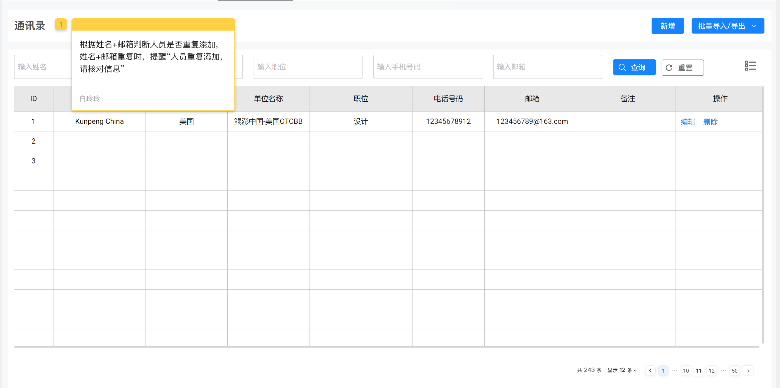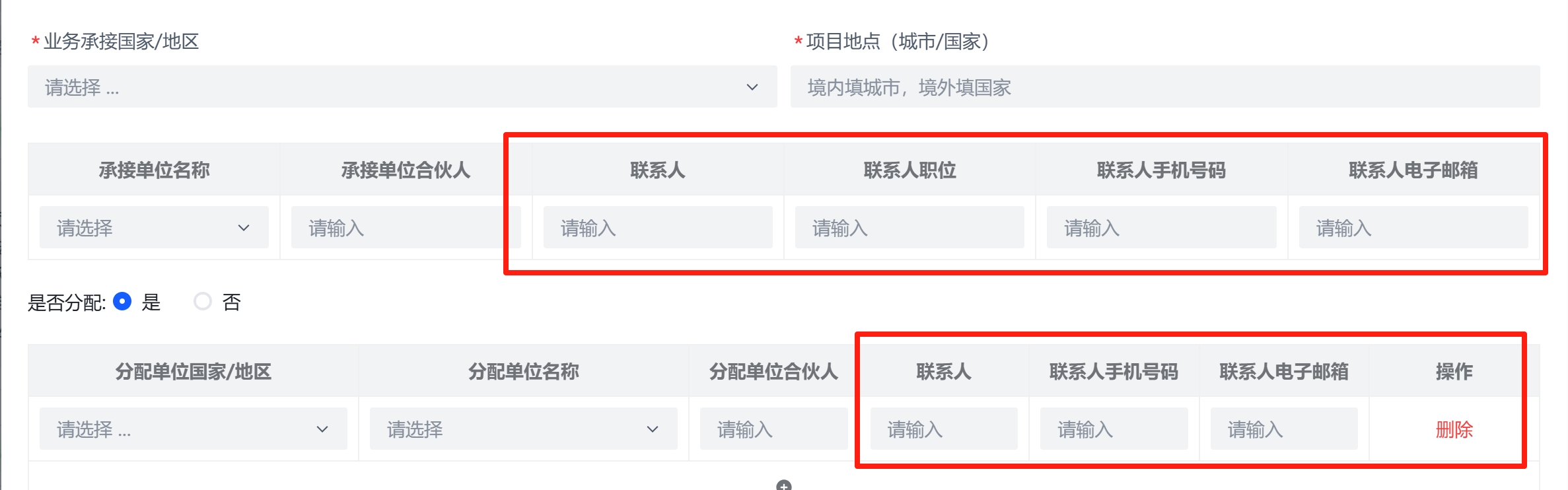 通讯录问题补充:下图中三个地方的联系人可从通讯录里带出,“联系人”是搜索选择框,“手机号码”,“电子邮箱”禁止输入,选择联系人后直接带出