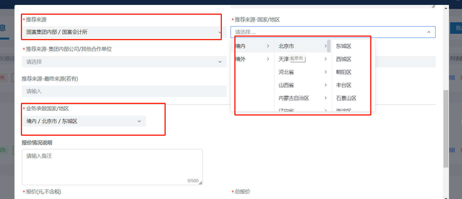 推荐来源-国家/地区为境内时:中国;承做单位-国家/地区为境内时:中国;