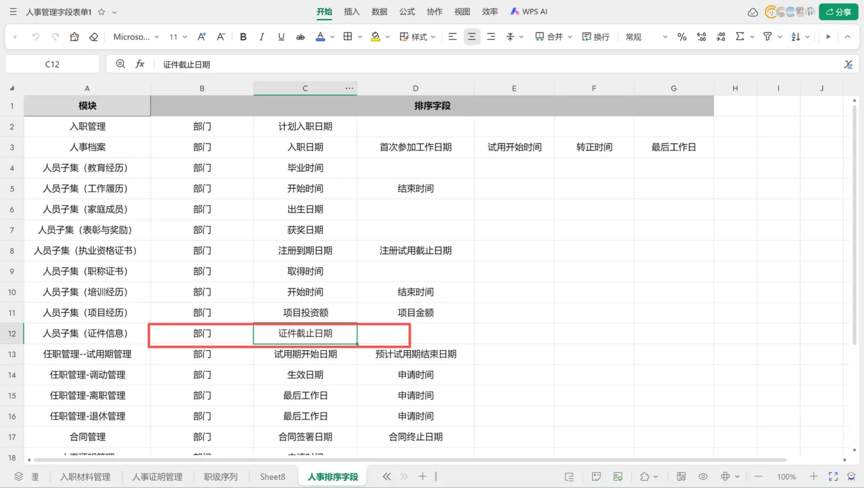 证件信息列表无表头筛选、字段排序