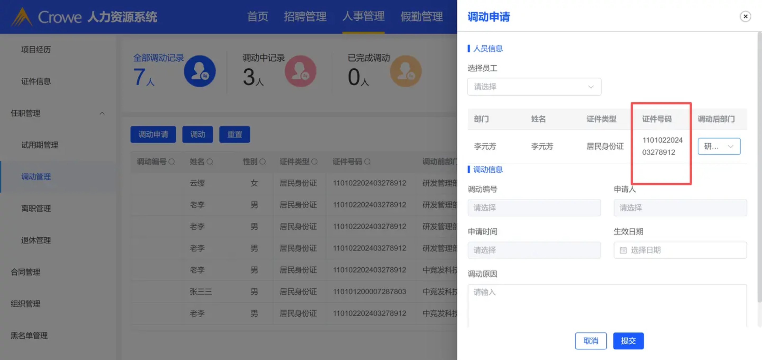 调动申请证件号码省略展示