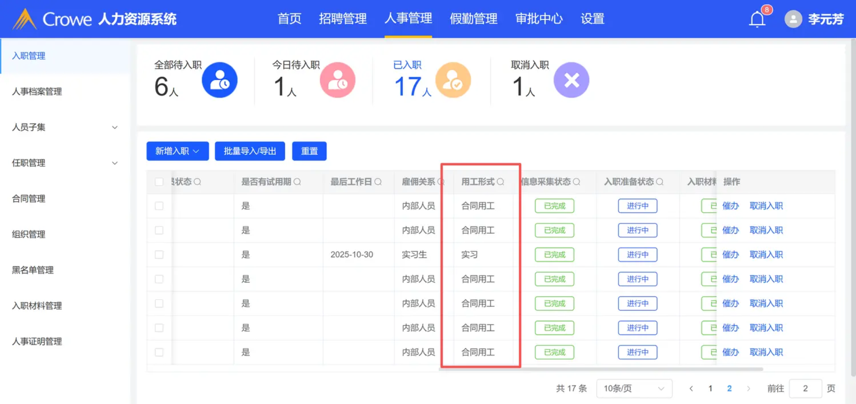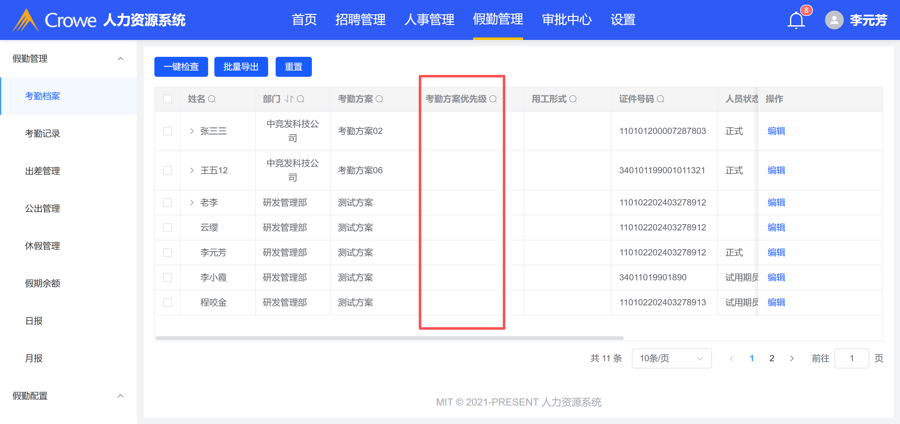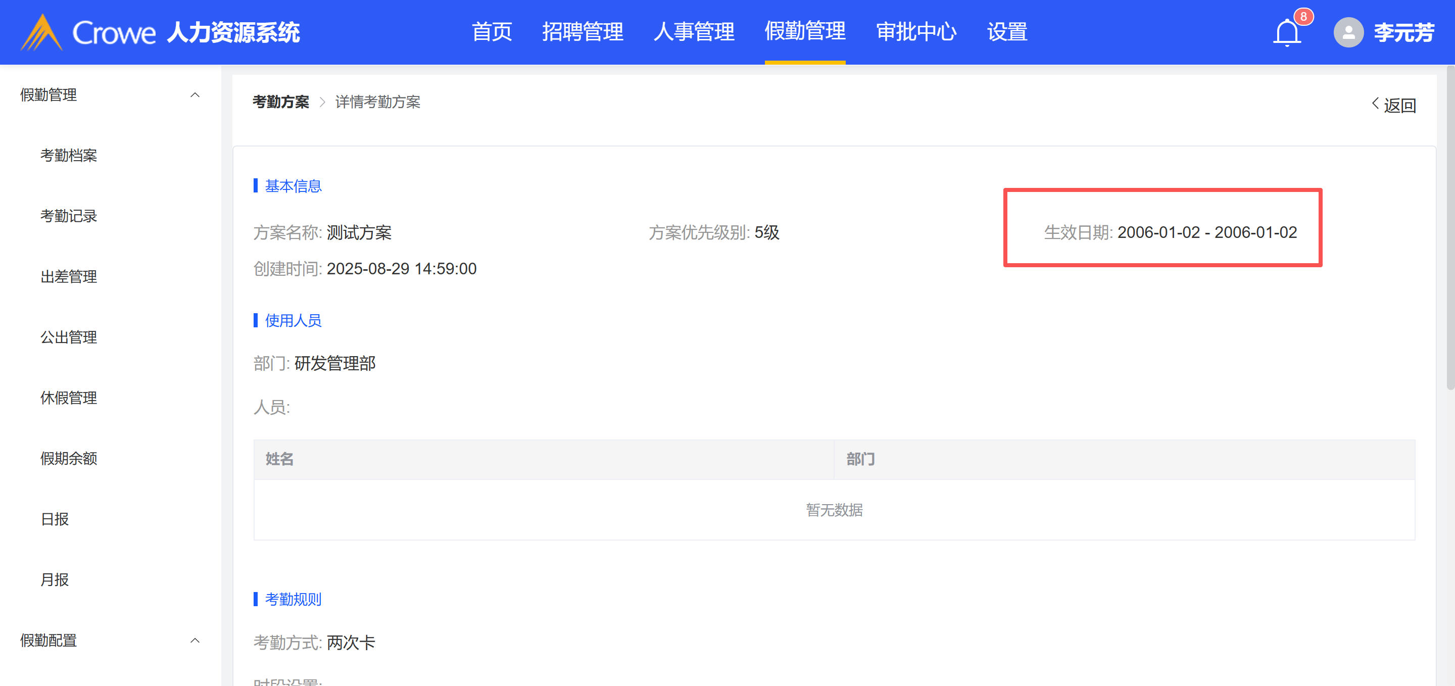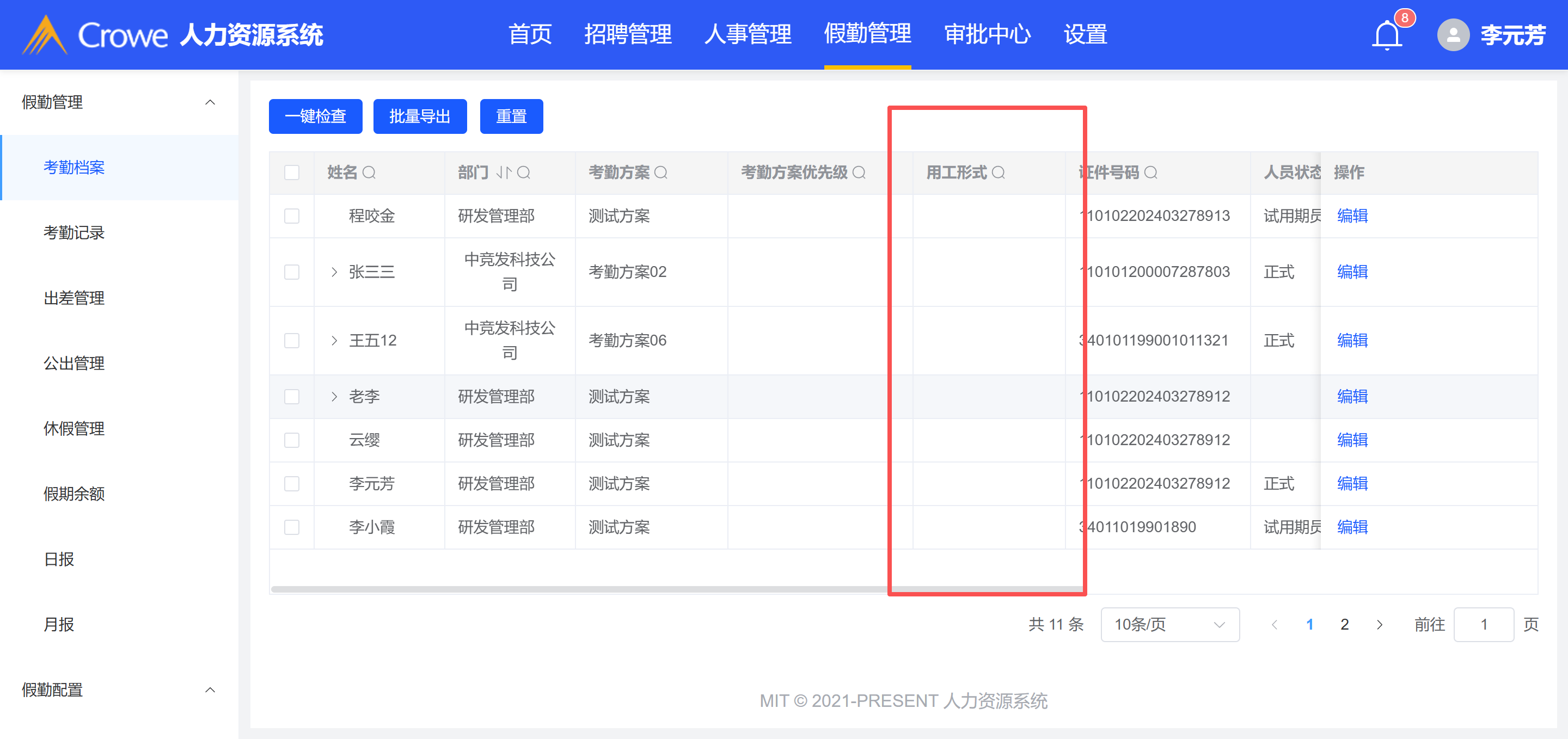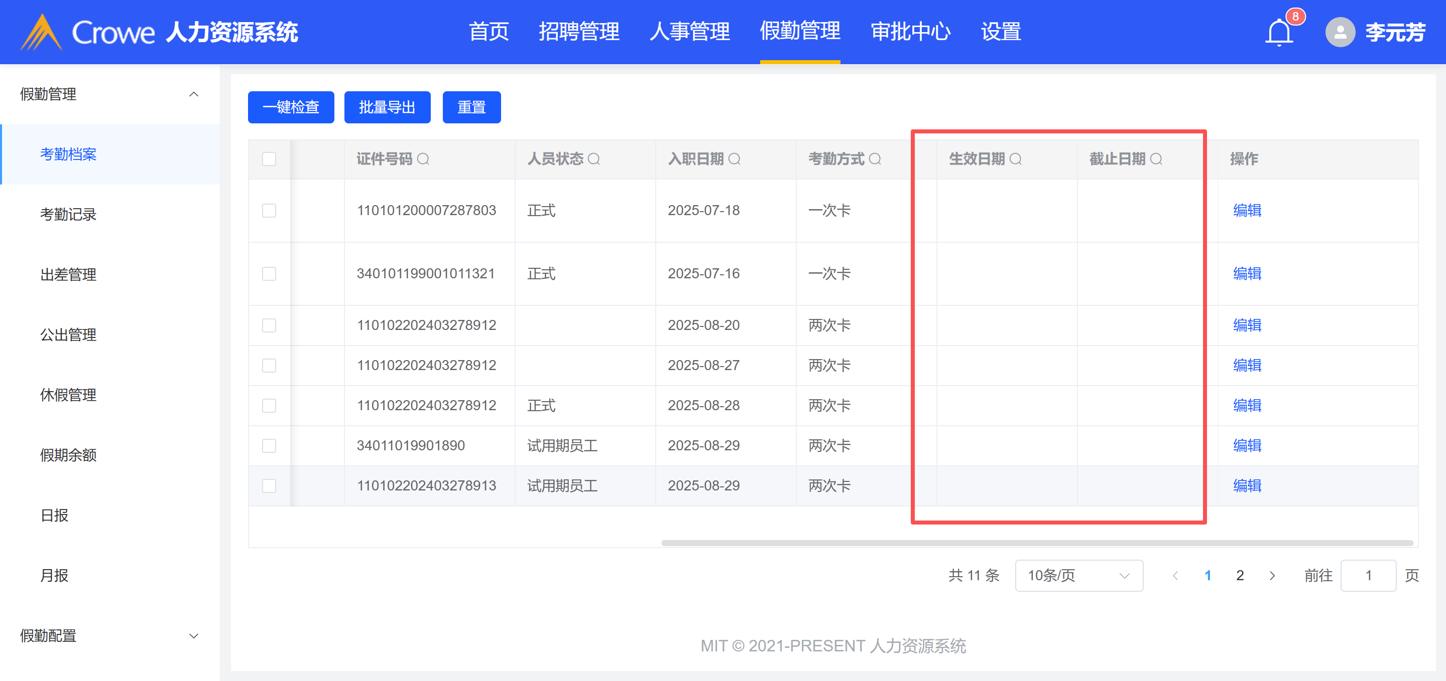 考勤档案人员列表未回显考勤方案的生效、截至日期、用工形式