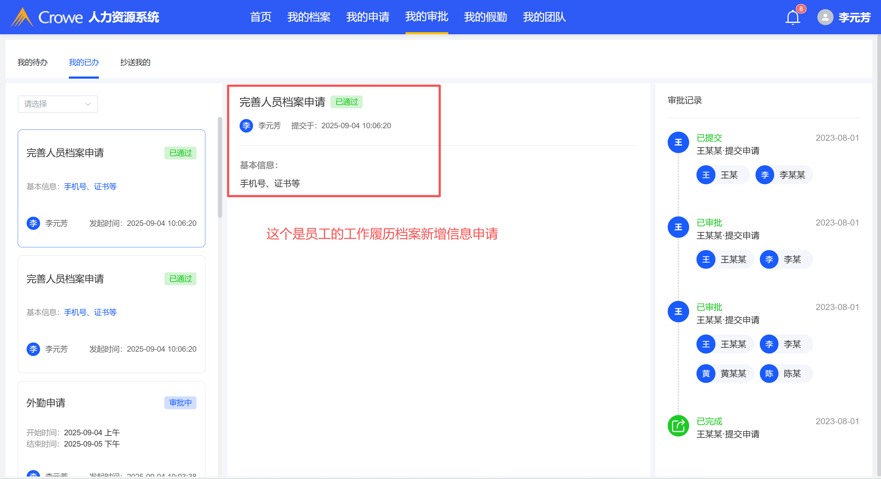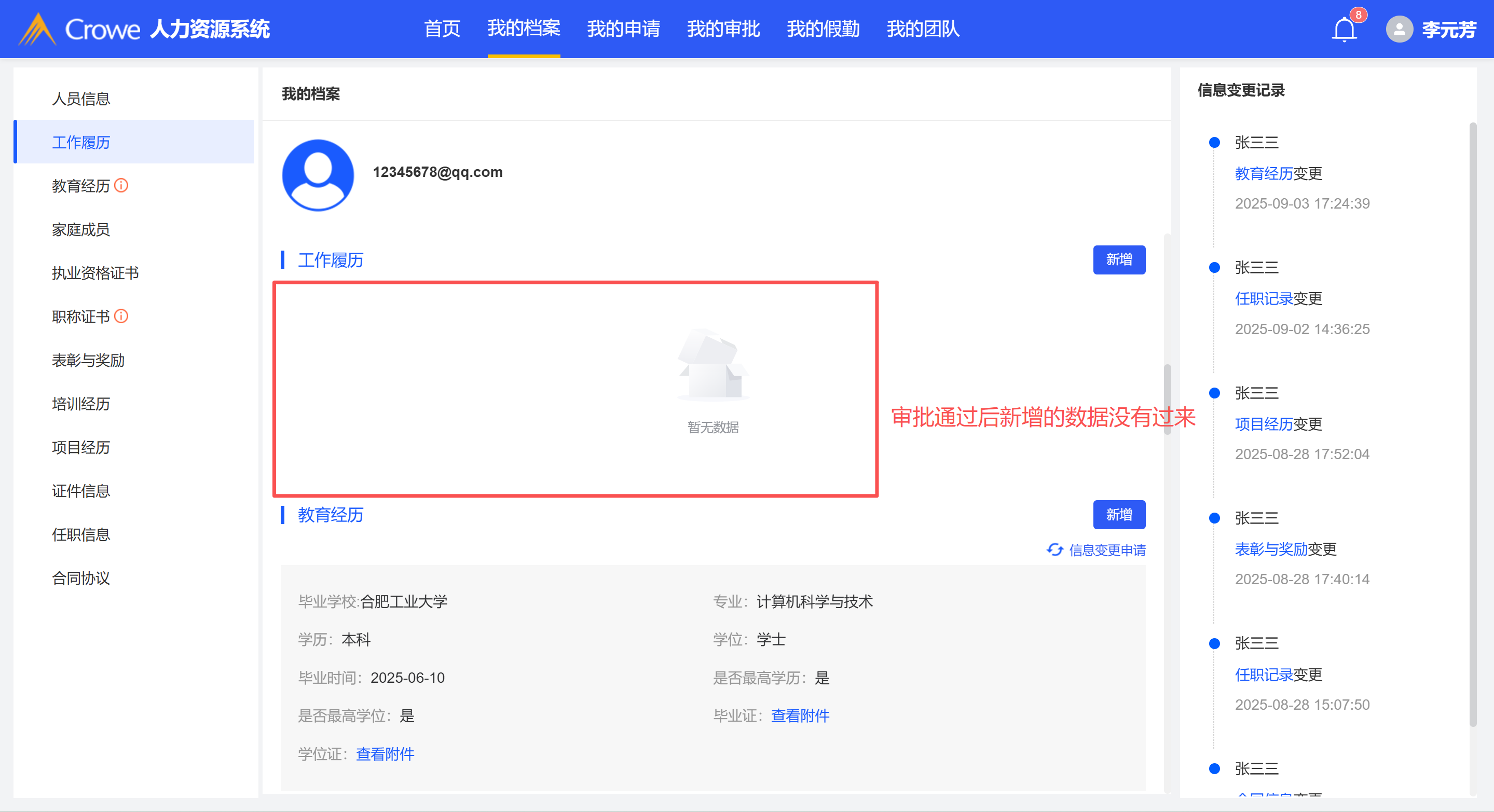 审批通过信息新增申请后,员工档案没有新增数据回显