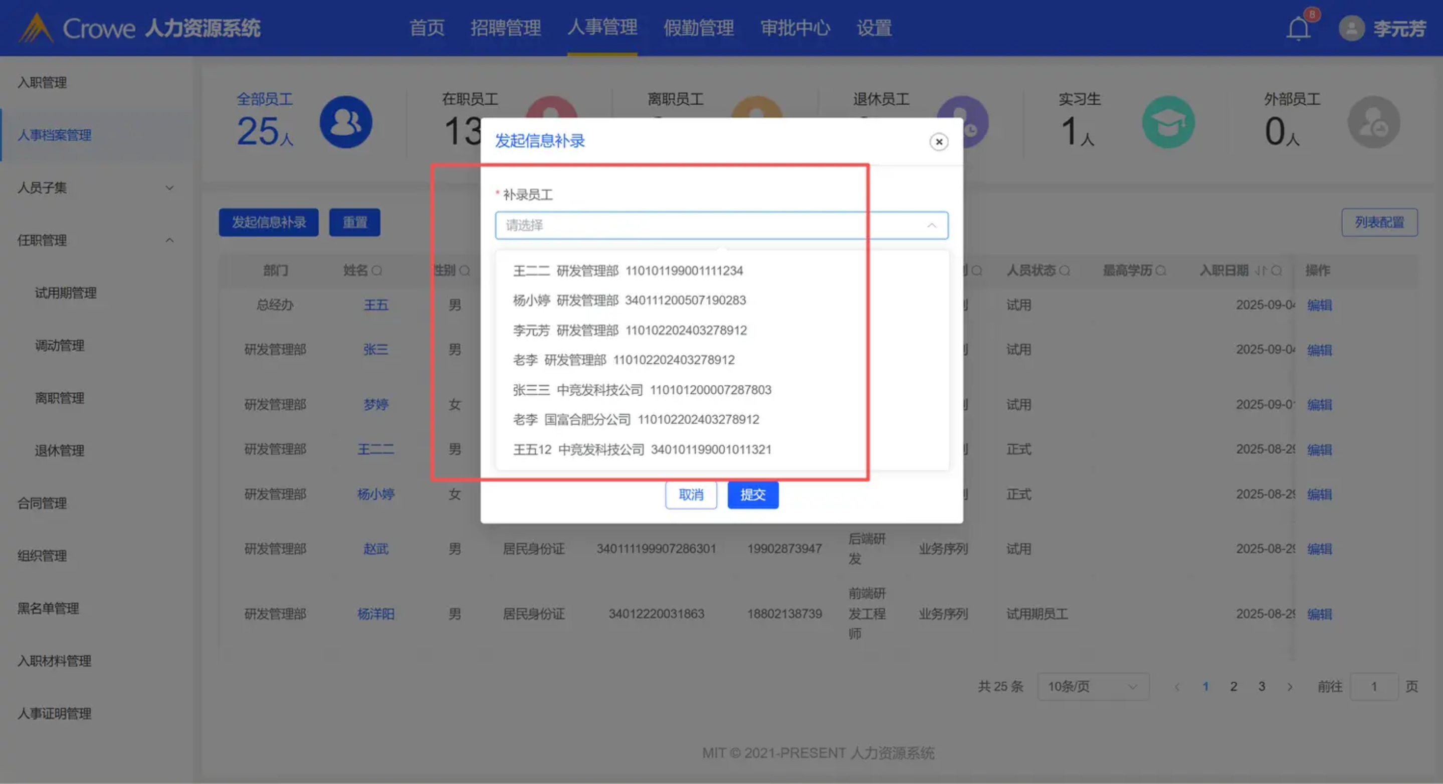 补录员工选择栏未获取新增员工数据