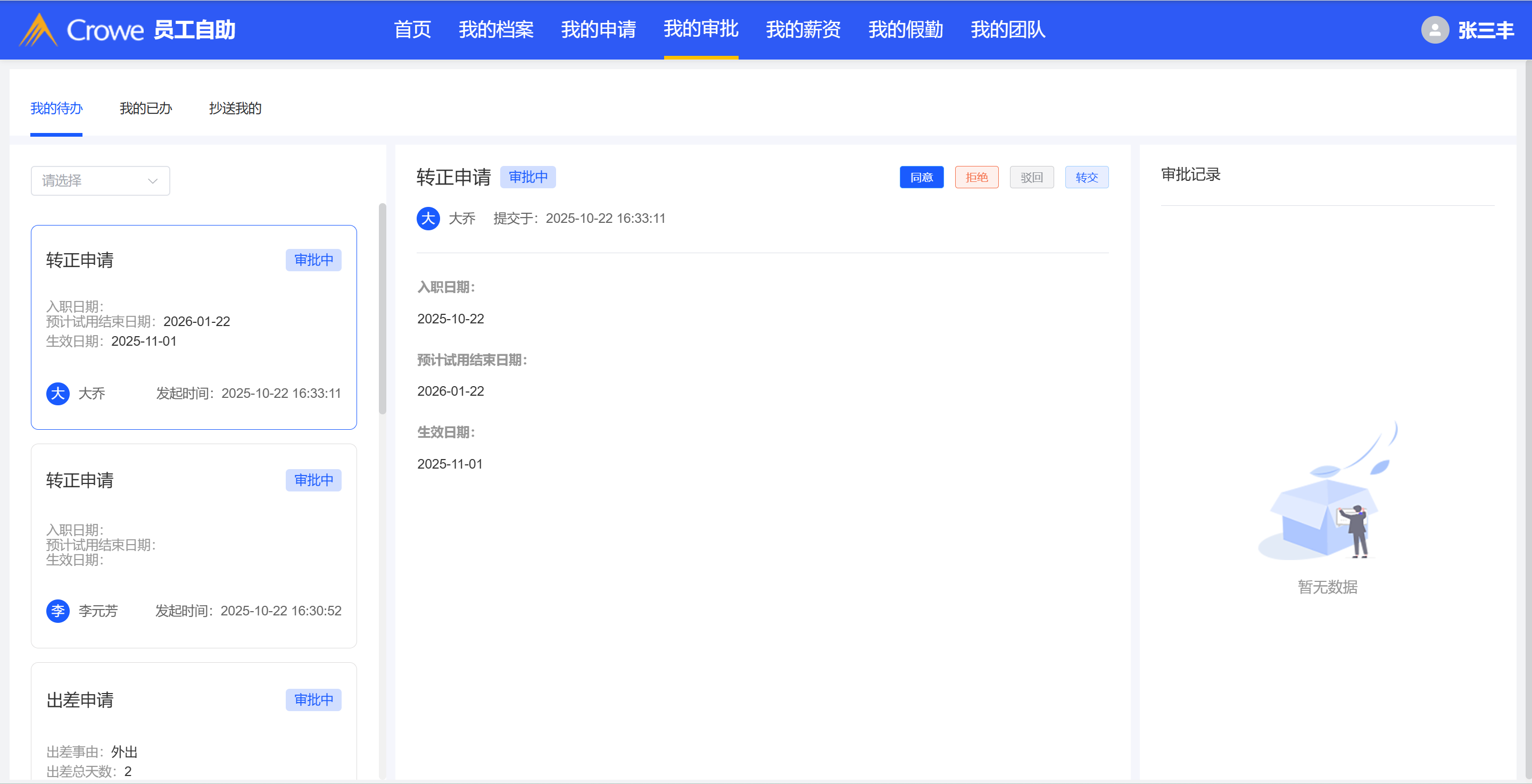 目前系统设计为:负责人帮员工发起申请,发起人没有数据,待审批表单在员工本人我的申请列表
