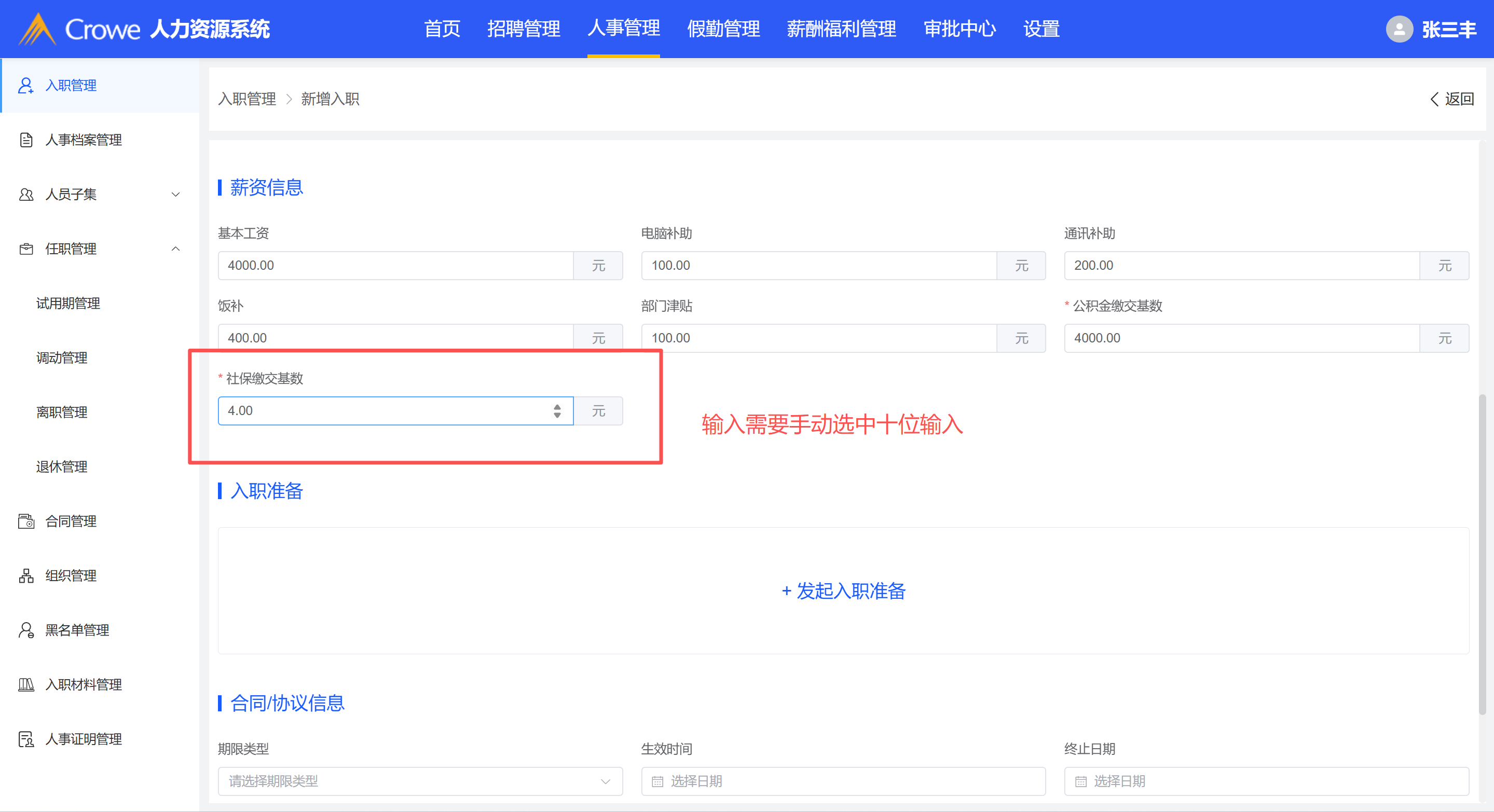 入职管理-新增员工入职输入社保缴交基数输入方式不正确