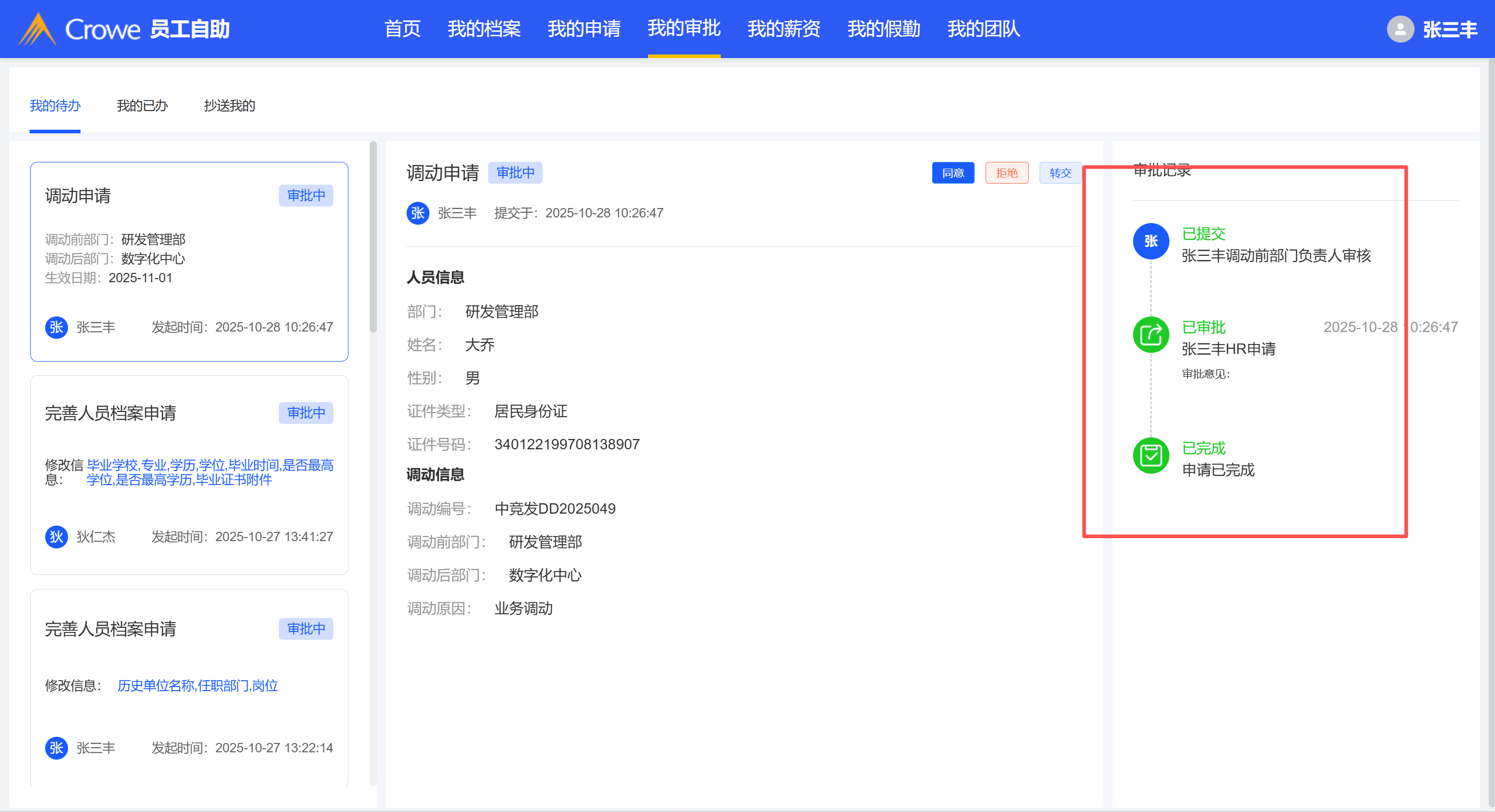 调动管理-提交的调动申请审批人顺序不对,HR申请节点自动审批完成