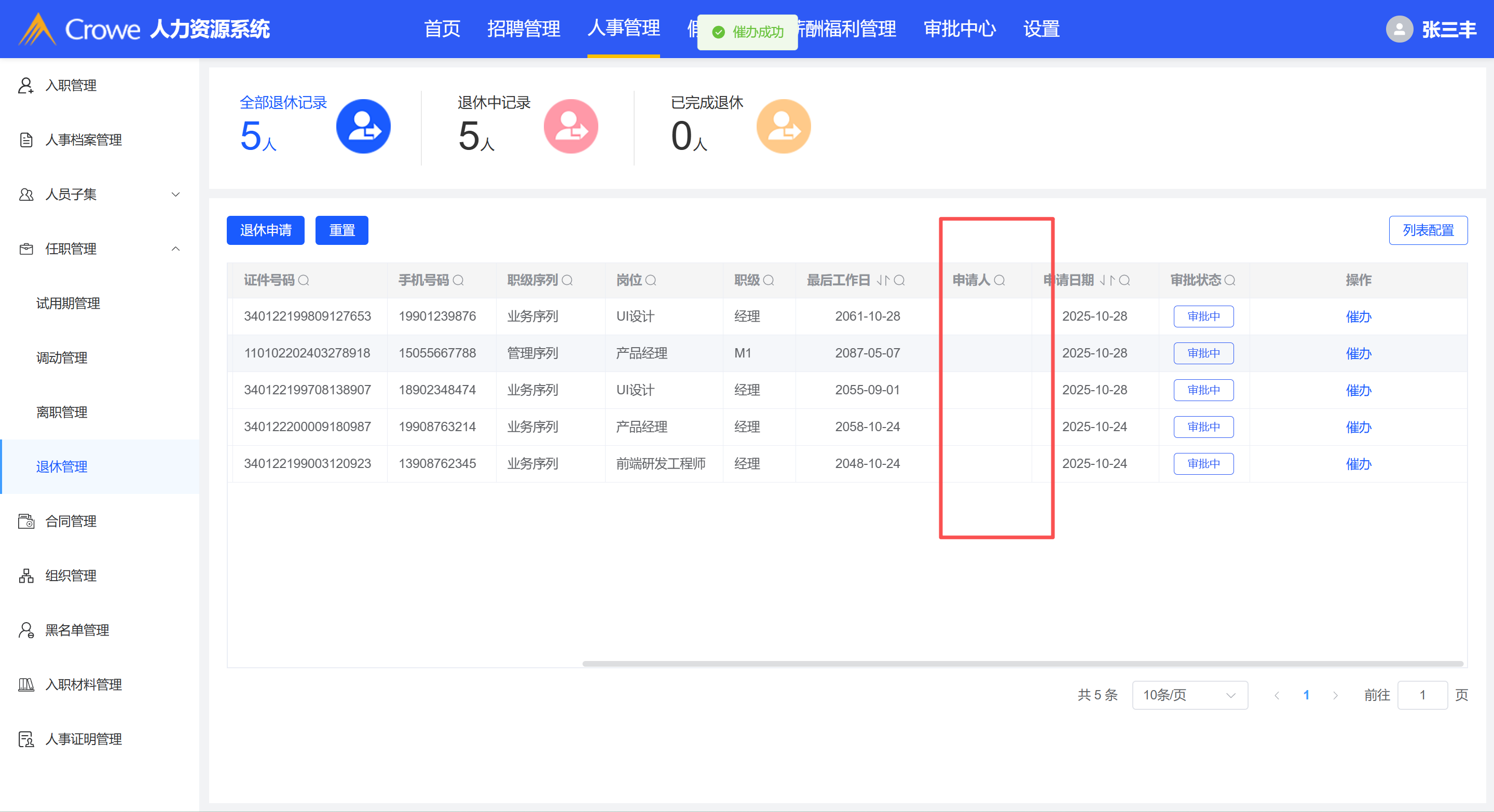 退休管理-退休列表未回显申请人数据