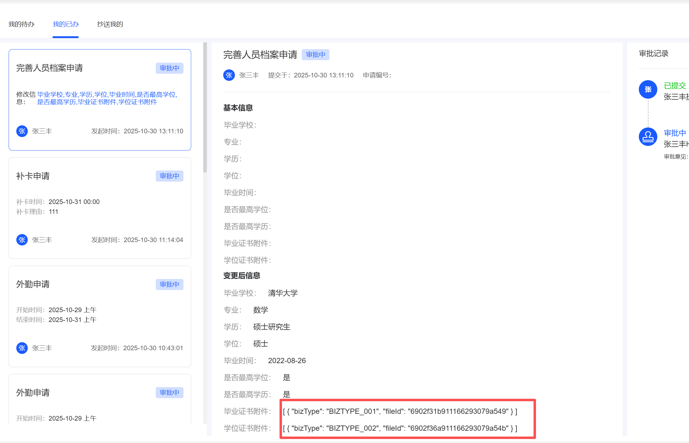 1.完善人员档案申请页面中上传的附件显示不出来,审批完成后附件无法下载 **