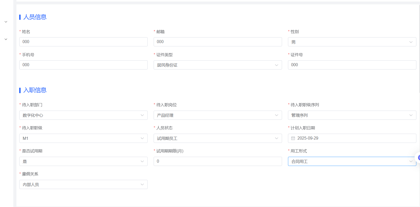 新增入职--员工,员工姓名为数字,新增成功。