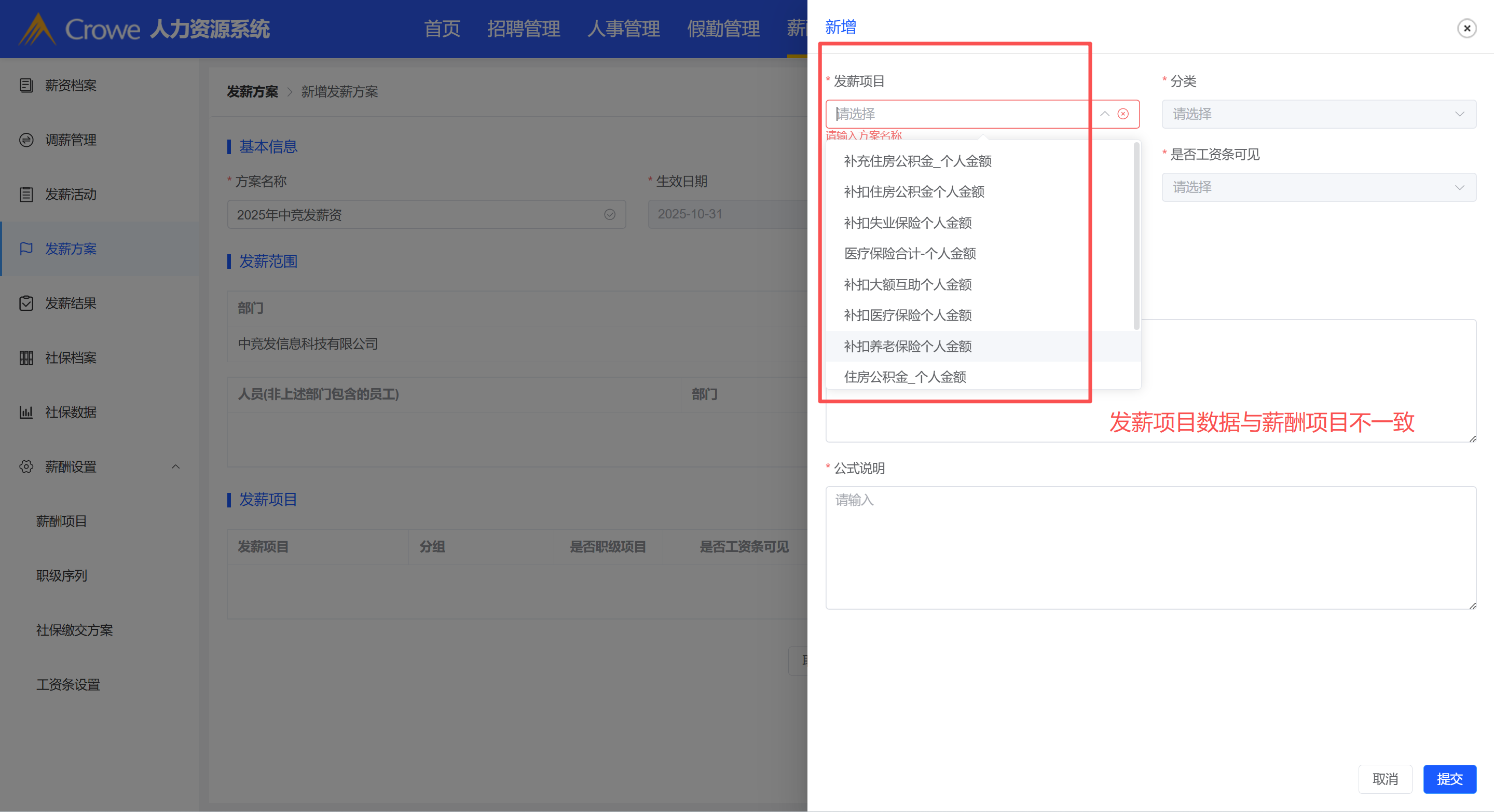 创建发薪项目时选择发薪项目的数据与薪酬项目数据不一致